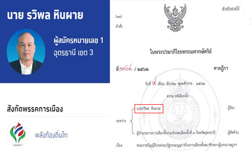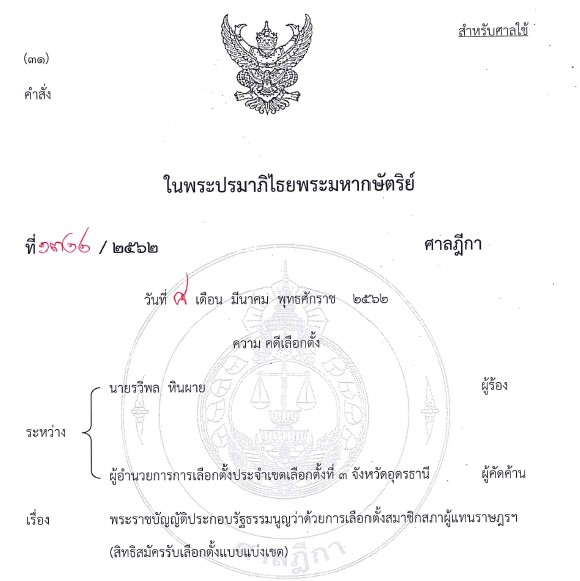 คำพิพากษาศาลฎีกาที่ 1322/1562 วันที่ 8 มี.ค.2562 ระหว่าง นายรวิพล หินผาย ผู้ร้อง ผู้อำนวยการการเลือกตั้งประจำเขตเลือกตั้งที่ 3 จังหวัดอุดรธานี ผู้คัดค้าน
