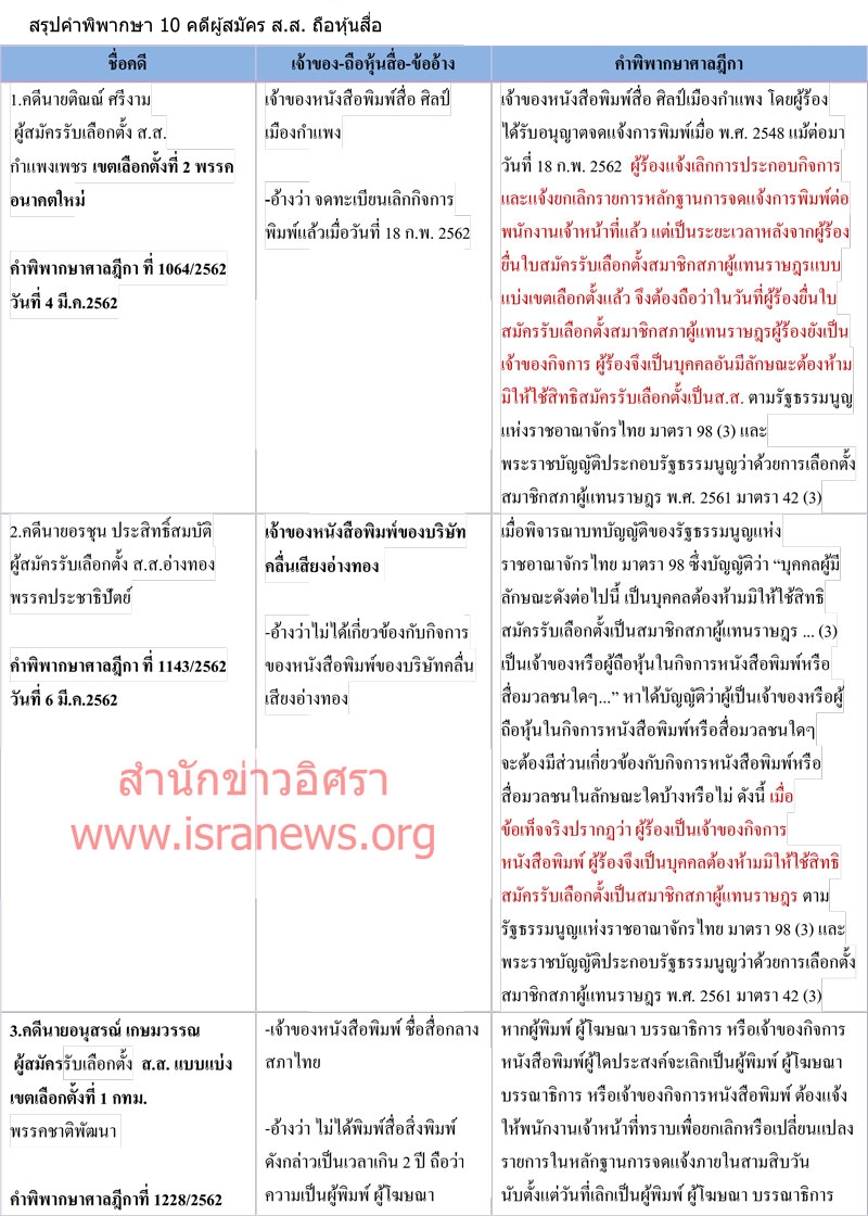เปิดครบข้อมูล 10 คดีผู้รับสมัคร ส.ส. 8 พรรคเล็ก ใหญ่ เจ้าของหนังสือพิมพ์ ถือหุ้นสื่อ ศาลฎีกาฟันขาดคุณสมบัติ 9 ราย รอด 1 ชำแหละข้อเท็จจริงรายคน เทียบชัดๆ ปม ‘ภูเบศวร์ - คมสัน’ เหมือน-ต่างกัน