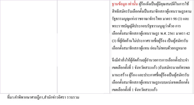 1.คดีนายภัทรพล มานะสร้าง ผู้สมัครรับเลือกตั้ง ส.ส. จังหวัดสระแก้ว เขต 1 พรรคพลังท้องถิ่นไท เจ้าของกิจการหนังสือพิมพ์ประชารัฐ