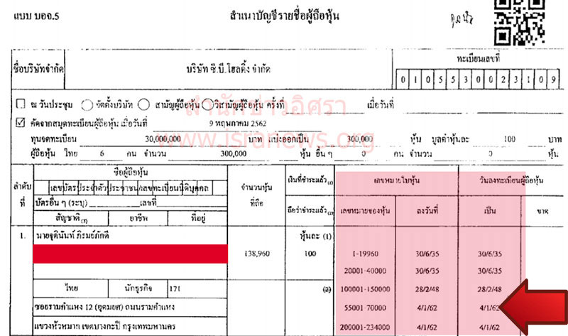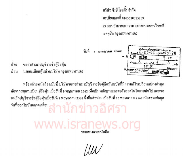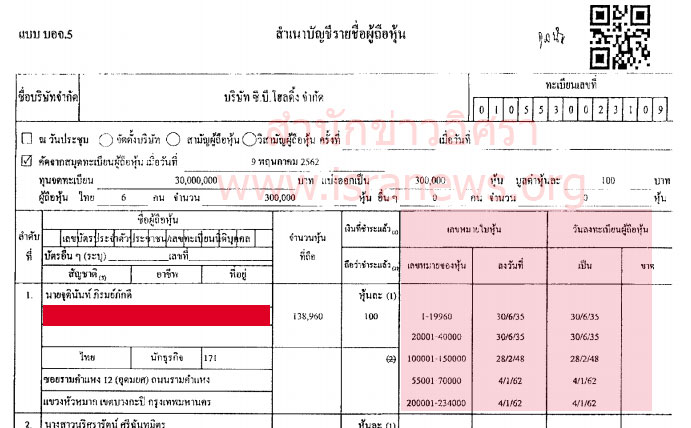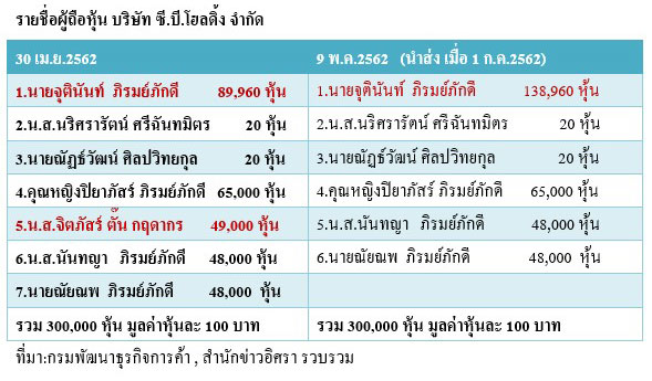 - ‘ตั๊น-จิตภัสร์’โอนหุ้น บ.ซี.บี.โฮลดิ้งให้พ่อ ยื่นล่าสุด 1 ก.ค. ระบุลงทะเบียนผู้ถือหุ้น 4/1/62