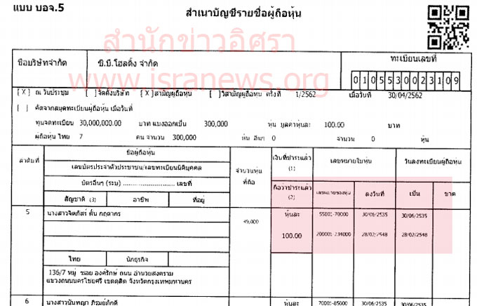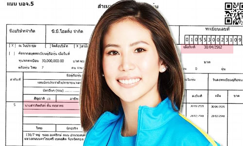 ‘ตั๊น-จิตภัสร์’โอนหุ้น บ.ซี.บี.โฮลดิ้งให้พ่อ ยื่นล่าสุด 1 ก.ค. ระบุลงทะเบียนผู้ถือหุ้น 4/1/62