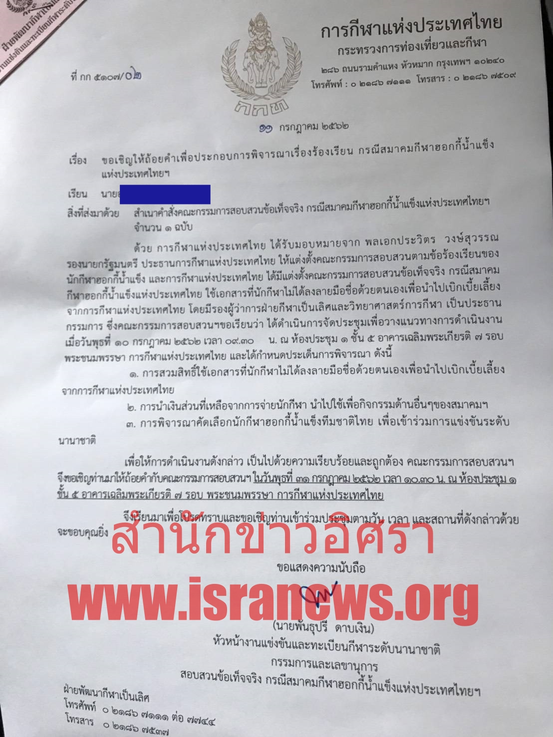 ส่วนเอกสารเชิญตัวนักกีฬาที่เกี่ยวข้องไปให้ข้อมูล ลงวันที่ 11 ก.ค. แจ้งประสานงานให้นำตัวนักกีฬาที่ได้รับผลกระทบจากกรณีนี้ เข้าให้ข้อมูลกับคณะกรรมการสอบสวน ในวันที่ 31 ก.ค.นี้ (ดูหนังสือประกอบ)