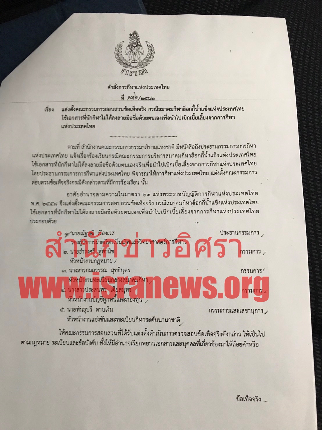 โดยคำสั่งแต่งตั้งคณะกรรมการสอบสวนข้อเท็จจริง เป็นระบุเลขที่ เรื่อง แต่งตั้งคณะกรรมการสอบสวนข้อเท็จจริง กรณีสมาคมกีฬาฮอกกี้น้ำแข็งแห่งประเทศไทย ใช้เอกสารที่นักกีฬาไม่ได้ลงลายมือชื่อด้วยตนเองเพื่อนําไปเบิกเบี้ยเลี้ยงจากการกีฬา แห่งประเทศไทย