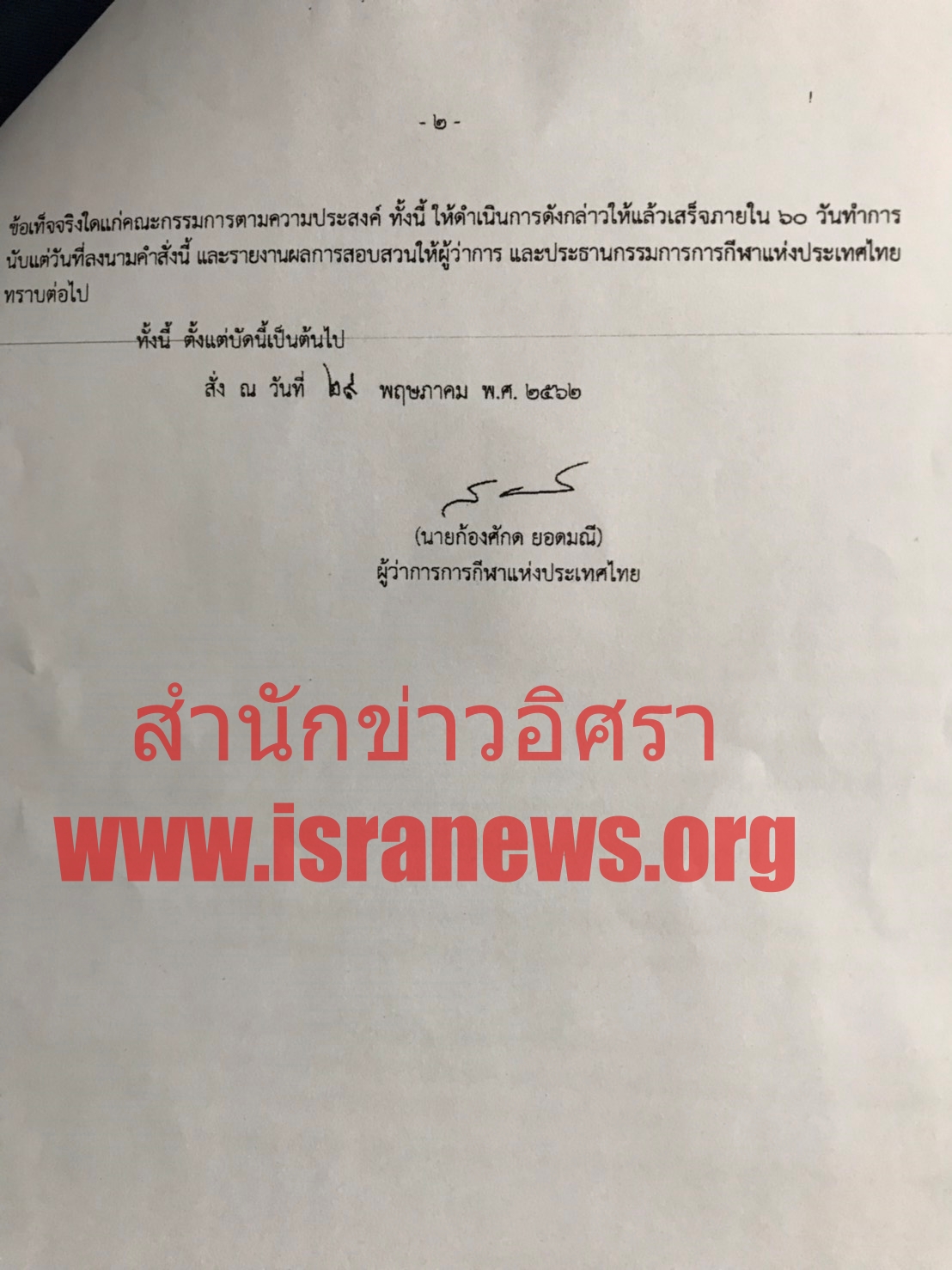 ลงนามคำสั่ง ณ วันที่ 24 พฤษภาคม พ.ศ. 2562 โดยนายก้องศักดิ์ ยอดมณี ผู้ว่าการการกีฬาแห่งประเทศไทย (ดูเอกสารประกอบ)