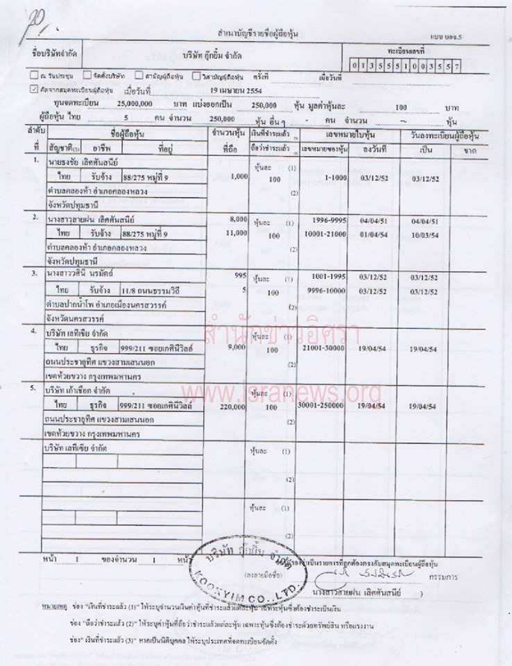 จากการตรวสอบพบว่า บริษัท กุ๊กยิ้ม จำกัด จดทะเบียนวันที่ 4 เม.ย. 2551 ทุน 25 ล้านบาท ที่ตั้งปัจจุบันเลขที่ 188 หมู่ที่ 6 ต.บ้านตุ่น อ.เมืองพะเยา จ.พะเยา ณ วันที่ 19 เม.ย.2554 บริษัท เก้าเชือก จำกัด ของกลุ่มนายพงษ์ศักดิ์ ถือหุ้นใหญ่ 220,000 หุ้น บริษัท เลทิเซีย จำกัด 9,000 หุ้น จากผู้ถือหุ้นทั้งหมด 5 ราย รวม 250,000 หุ้น