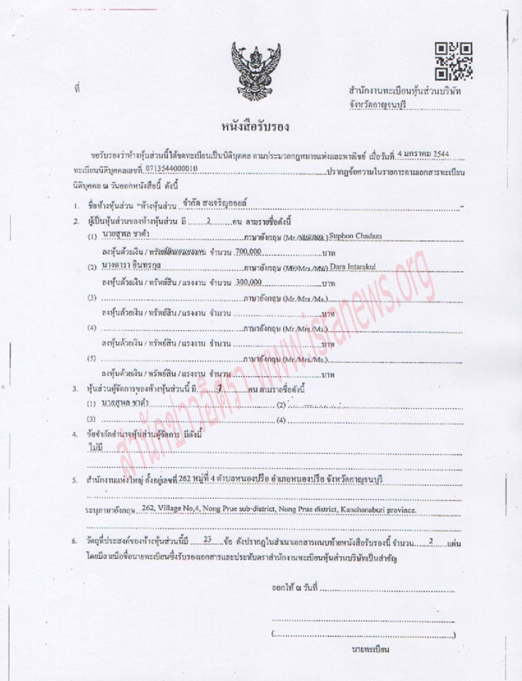 ทั้งสองคนถือหุ้นเรื่อยมากระทั่ง วันที่ 9 ม.ค. 2562 มีการเปลี่ยนแปลง โดยนายสุพล ชาดำ ลงหุ้น 700,000 บาท และนางดารา อินทรกุล 300,000 บาท นายสุพล ชาดำ เป็นหุ้นส่วนผู้จัดการ (ดูเอกสาร)