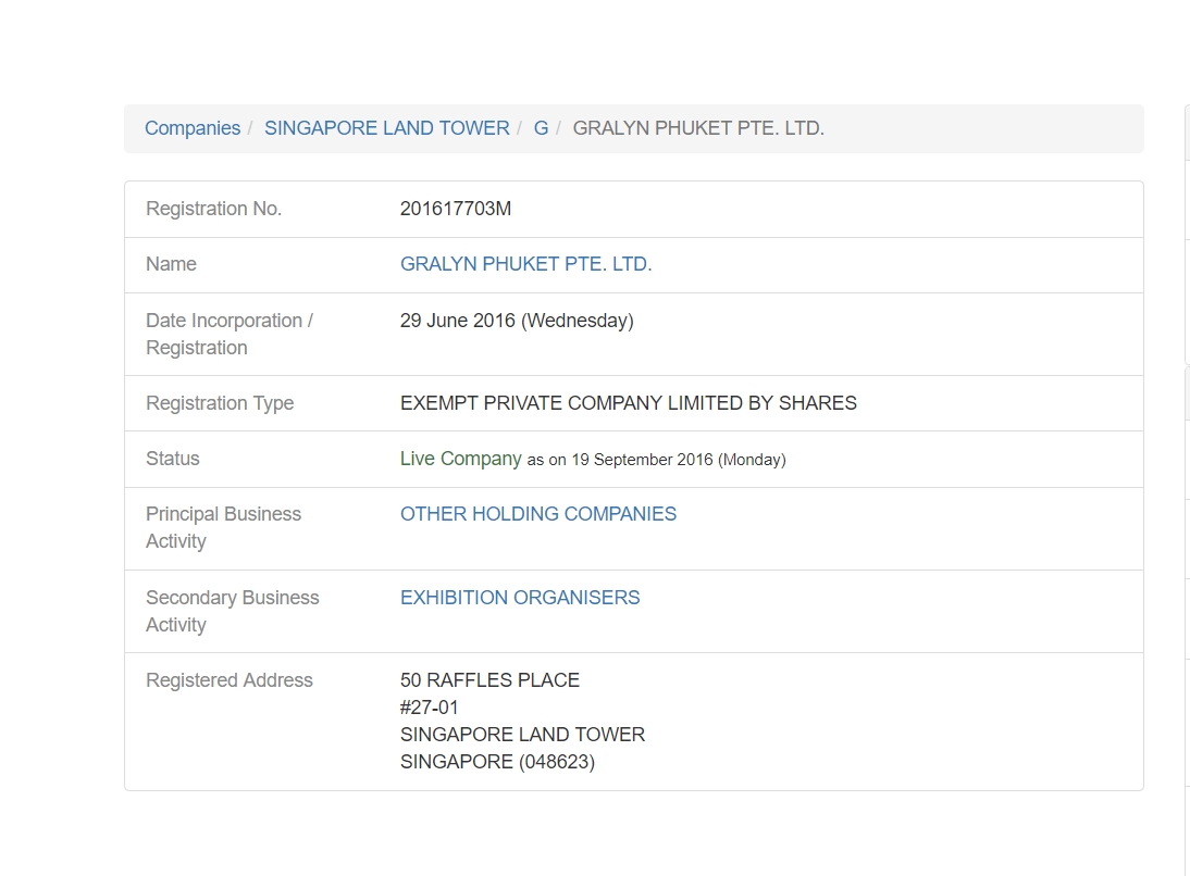 บริษัท Gralyn Phuket PTE.LTD ...จดทะเบียนเมื่อวันที่ 26 มิ.ย. 2559 หรือก่อนหน้าวันที่บริษัท กะตะ บีช ได้จดทะเบียนเพียงแค่ 1 วัน ส่วนบริษัท กะตะ บีช จดทะเบียนเมื่อวันที่ 27 มิ.ย. 2559 โดยวัตถุประสงค์การจดทะเบียนของบริษัทหลักนั้นเป็นการจดทะเบียนเพื่อเข้าไปถือหุ้นและครอบครองบริษัทอื่นๆ (Holding Company) ส่วนวัตถุประสงค์รองของบริษัทแจ้งว่าจัดงานอีเวนท์ต่างๆส่วนที่อยู่ของบริษัทนั้นแจ้งว่าอยู่ที่ 50 RAFFLES PLACEเลขที่ #27-01 อาคาร SINGAPORE LAND TOWER ประเทศ SINGAPORE