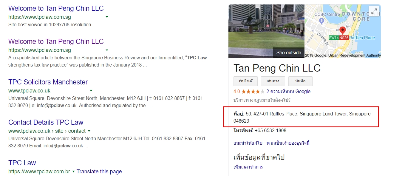 อย่างไรก็ตาม สำนักข่าวอิศราได้นำเอาที่อยู่ 50 RAFFLES PLACE#27-01SINGAPORE LAND TOWER ของบริษัท ไปสืบค้นในโลกออนไลน์ ก็พบข้อมูลที่น่าสนใจอย่างหนึ่งว่าที่อยู่แห่งนี้นั้นเป็นที่อยู่ของสำนักกฎหมายที่ชื่อว่า Tan Peng Chin หรือที่มีตัวย่อว่า TPC Law Firm ของสิงคโปร์ (ดูภาพประกอบ:)