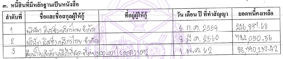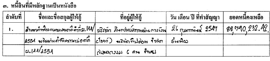 หนี้สิน 88,790,232.42 บาท (หนี้สินที่มีหลักฐานเป็นหนังสือ)