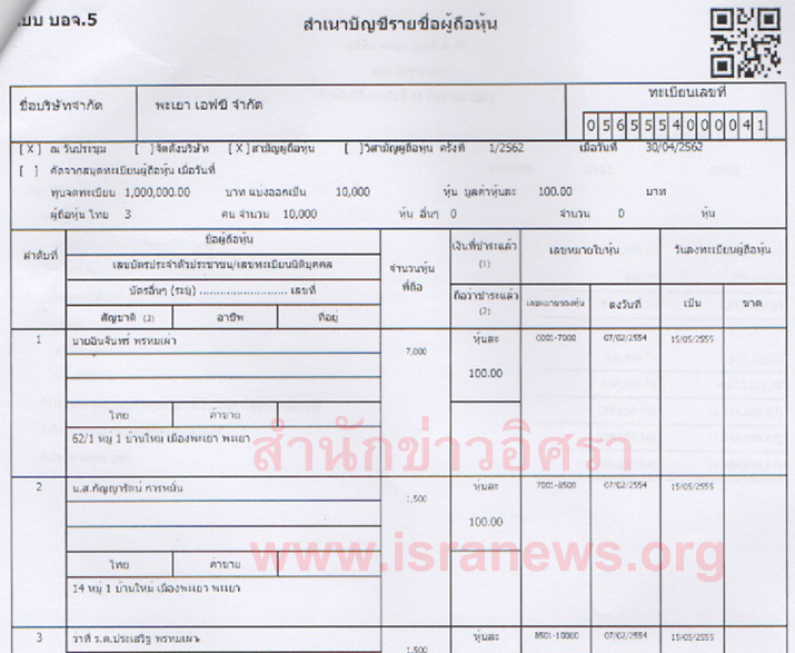 2. บริษัท พะเยาเอฟซี จำกัด จำนวน 1,500 หุ้น มูลค่าหุ้นละ 100 บาท (ดูเอกสาร)
