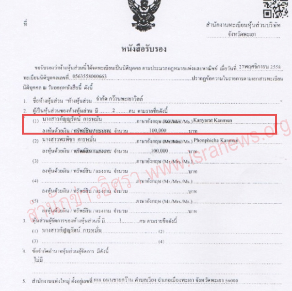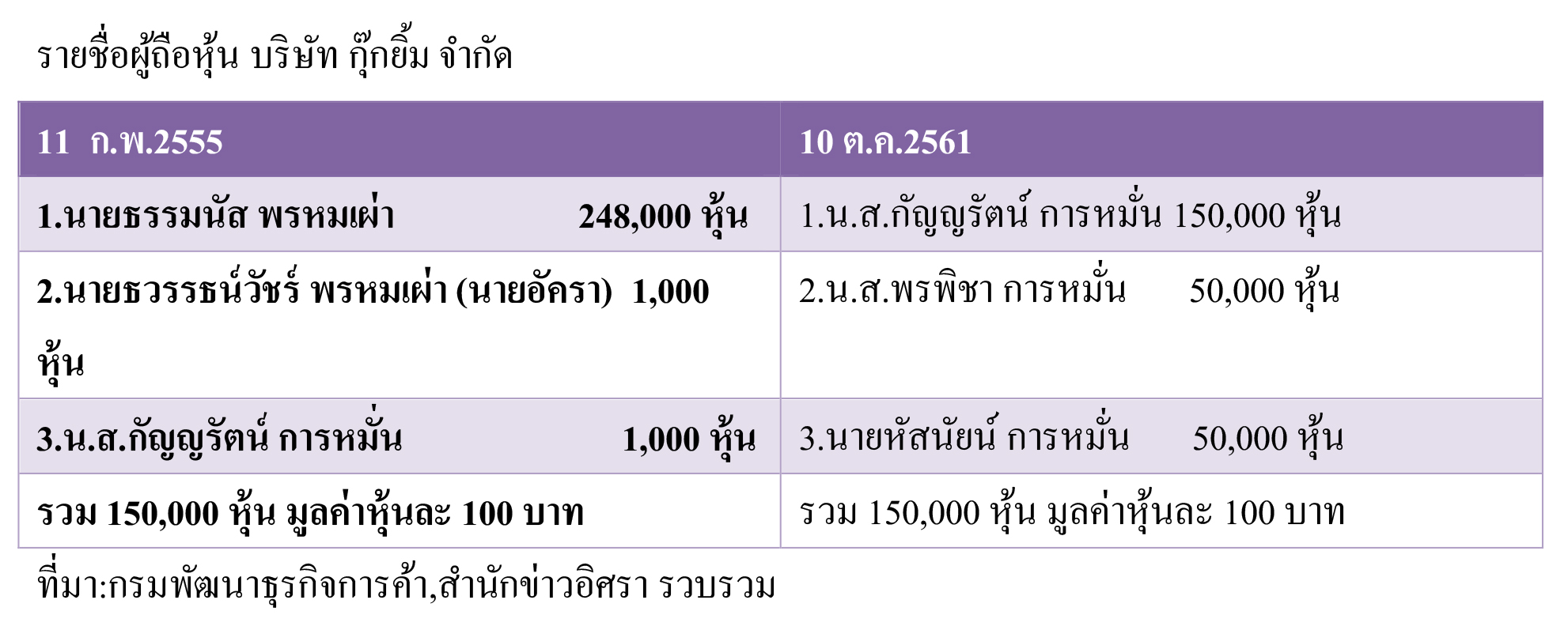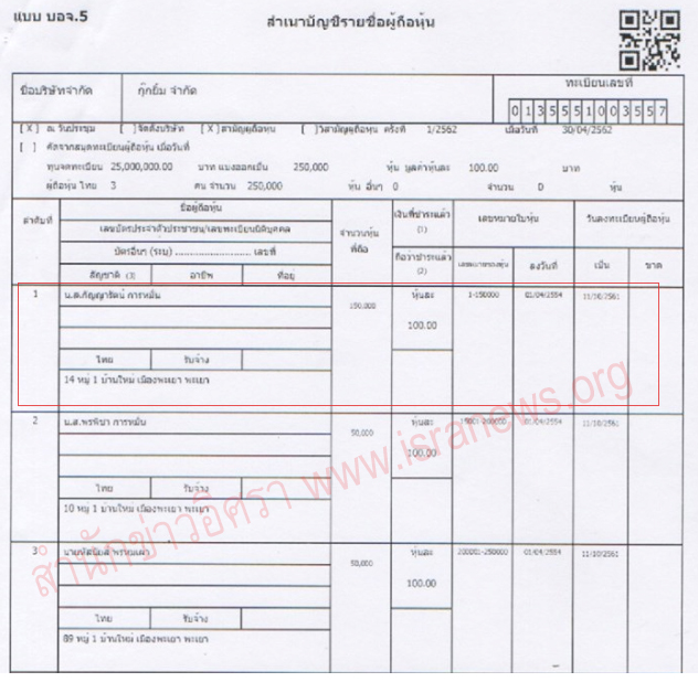 1.บริษัท กุ๊กยิ้ม จำกัด จำนวน 150,000 หุ้น มูลค่าหุ้นละ 100 บาท (ดูตารางและ เอกสาร)