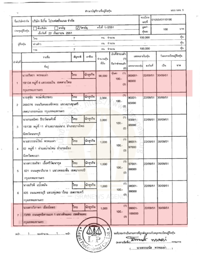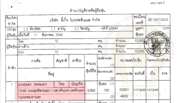 3.ที่อยู่เลขที่ 73/99 ถ.สุทธิสารสามแยก 1 แขวงดินแดง เขตดินแดง กรุงเทพฯ เป็นที่อยู่เดียวกับที่อยู่ของ นางธนสร พรหมเผ่า (ชื่อเดิมของนางอริสรา พรหมเผ่า) ตามที่แจ้งในสำเนาบัญชีรายชื่อผู้ถือหุ้น เมื่อวันที่ 11 ธ.ค. 2545 และเอกสารการเป็นกรรมการบริษัทฯเมื่อวันที่ 23 ธ.ค. 2545 (ดูเอกสาร)