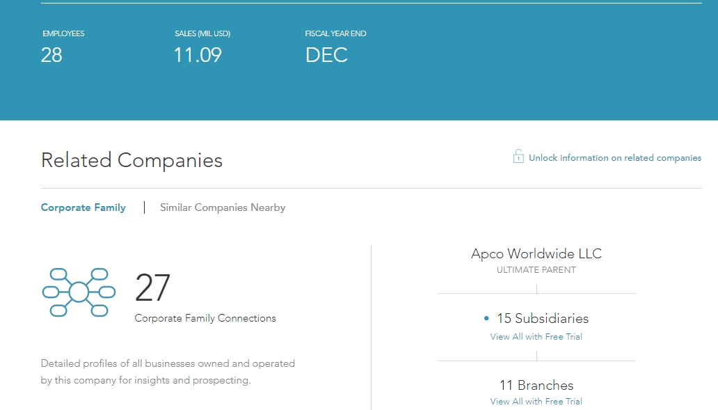 ปัจจุบันมีจำนวนพนักงานที่แจ้งไว้อยู่ 28 คน และมีบริษัทที่เกี่ยวข้องจำนวน 27 แห่ง แบ่งเป็นบริษัทย่อย 15 แห่ง และบริษัทสาขา 11 แห่ง