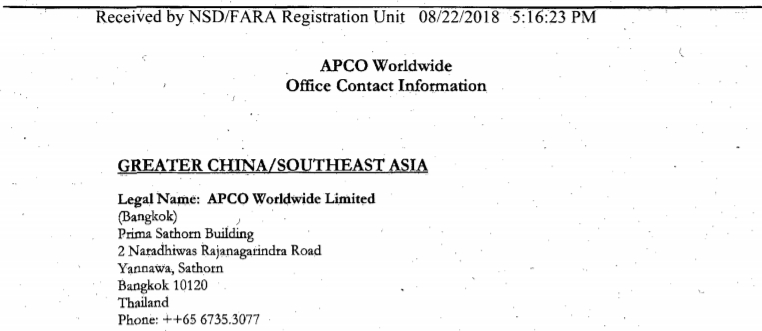 เมื่อตรวจสอบข้อมูลลึกลงไปพบว่า บริษัทแอพโกฯ มีบริษัทสาขาอยู่ในประเทศไทยด้วย ใช้ชื่อว่า Apco Worldwide Limited ตั้งอยู่ที่อาคารพรีม่า สาธร ถนน นราธิวาสราชนครินทร์ แขวง ทุ่งมหาเมฆ เขต สาทร กรุงเทพมหานคร