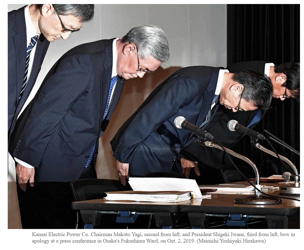 โดยเมื่อวันที่ 2 ต.ค.ที่ผ่านมา สำนักข่าวไมนิจิของญี่ปุ่น ได้นำเสนอข่าวเปิดโปงกรณีพนักงานระดับบริหารของบริษัท Kansai Electric Power Co.Ltd. (KEPCO) จำนวน 20 ราย มีส่วนในการรับเงินและของขวัญจากนักการเมืองท้องถิ่นเป็นมูลค่ารวมทั้งสิ้น 318.45 ล้านเยน (90,584,694 บาท)