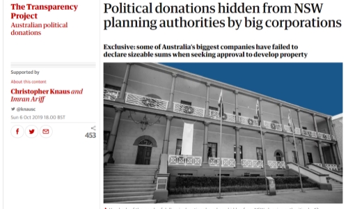 โดยเมื่อวันที่ 6 ต.ค.2562 สำนักข่าวการ์เดี้ยนสาขาออสเตรเลีย ของประเทศอังกฤษ ได้นำเสนอรายงานข่าวชิ้นหนึ่ง ระบุถึงปัญหาการไม่แจ้งข้อมูลการบริจาคเงินของบริษัทหลายแห่งให้กับพรรคการเมืองในรัฐนิวเซาธ์เวลส์ของออสเตรเลีย