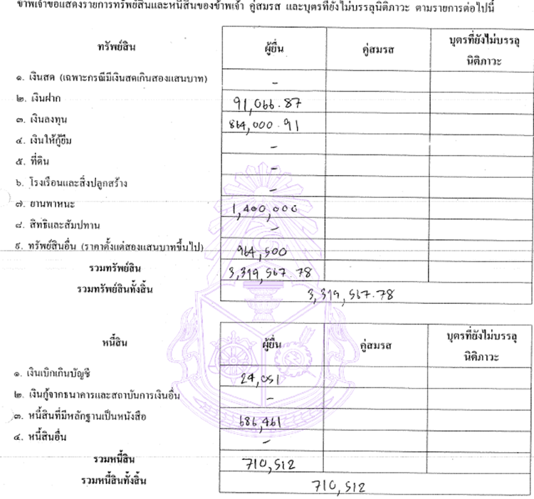 พลิกบัญชีแสดงรายการทรัพย์สินและหนี้สินที่ยื่นต่อคณะกรรมการป้องกันและปราบปรามการทุจริตแห่งชาติ (คณะกรรมการ ป.ป.ช.) กรณีเข้ารับตำแหน่ง ส.ส. วันที่ 25 พ.ค.2562 โดยยื่นเมื่อ 23 ส.ค.2562 ระบุว่ามีทรัพย์สิน 3,319,567.78 บาท ประกอบด้วย เงินฝาก 4 บัญชียอดรวม 91,0ุ66.87 บาท (ไม่มีเงินสด) เงินลงทุน 8 รายการ 864,000.91 บาท ยานพาหนะ รถยนต์ 2 คัน ยี่ห้อ แคมรี กับ รถตู้โตยต้า อัลพาร์ด รวม 1,400,000 บาท ทรัพย์สินอื่น อาทิ เครื่องปรับ รวม 12 รายการ 964,500 บาท หนี้สิน เบิกเกินบัญชี 24,051 บาท หนี้สินที่มีหลักฐานเป็นหนังสือ 686,461 บาท (หนี้ผ่อนรถตู้อัลพาร์ด ทำสัญญา 24 ม.ค.2560) รวมหนี้สิน 710,512 บาท มีทรัพย์สินมากกว่าหนี้สิน 2,609,055.78 บาท