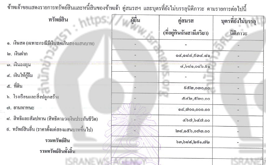 นางอริสรา พรหมเผ่า คู่สมรส มีทรัพย์สิน 189,952,776.99 บาท หนี้สิน 13,582,860.47 บาท