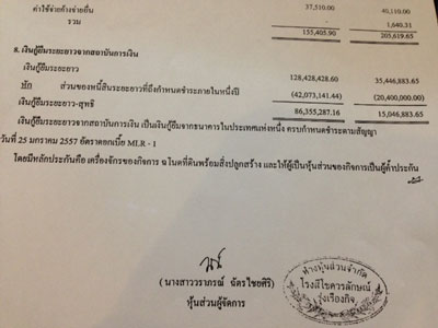 นอกจากนี้ ยังมีเงินเบิกเกินบัญชี จากธนาคาร จำนวน 14,496,312.15 บาท และตั๋วสัญญาใช้เงิน 732,500,000 บาท และมีเงินกู้ยืมระยะยาวจากสถาบันการเงิน จำนวน 128,428,428.60 บาท ครบกำหนดชำระตามสัญญา วันที่ 25 ม.ค. 57 มีหลักประกันคือ เครื่องจักรของกิจการ โฉนดที่ดินพร้อมสิ่งปลูกสร้าง และให้ผู้เป็นหุ้นส่วนของกิจการเป็นผู้ค้ำประกัน