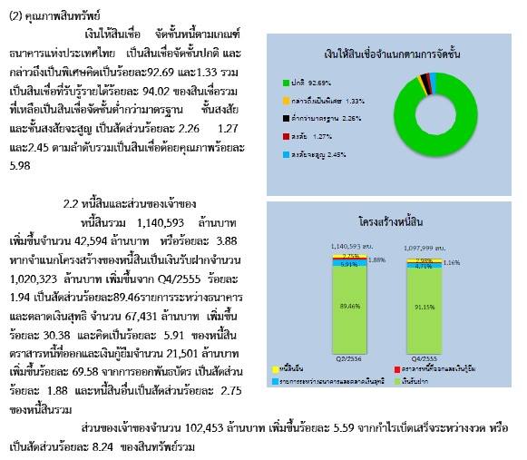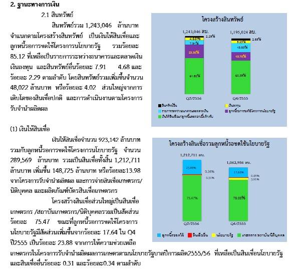 1.ธนาคารเพื่อการเกษตรและสหกรณ์การเกษตร (ธ.ก.ส.) ประกาศฐานะการเงินในไตรมาสที่ 2 เมื่อวันที่ 30 กันยายน 2556 ระบุว่า มีสินทรัพย์รวมทั้งสิ้น 1,243,046 ล้านบาท