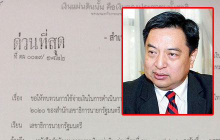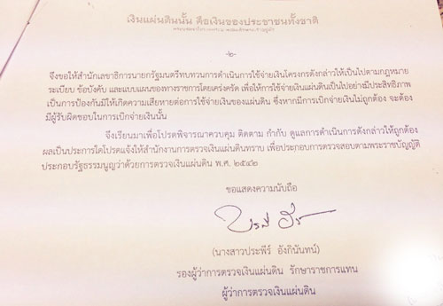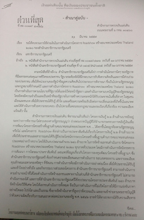 หมายเหตุ : เป็นหนังสือ สตง. ฉบับเต็ม ที่ทำถึงนายสุรนันทน์ เวชชาชีวะ เลขาธิการนายกรัฐมนตรี เพื่อยืนยันความเห็นให้ สลน.ทบทวนการจ่ายเงินว่าจ้าง บริษัท มติชน จำกัด (มหาชน) และบริษัท สยามสปอร์ต ซินดิเคท จำกัด (มหาชน) จัดงานประชาสัมพันธ์โครงการ Roadshow สร้างอนาคตประเทศไทย Thailand 2020 ทุกภาคทั่วประเทศ จำนวน 10 จังหวัด วงเงิน 240 ล้านบาท