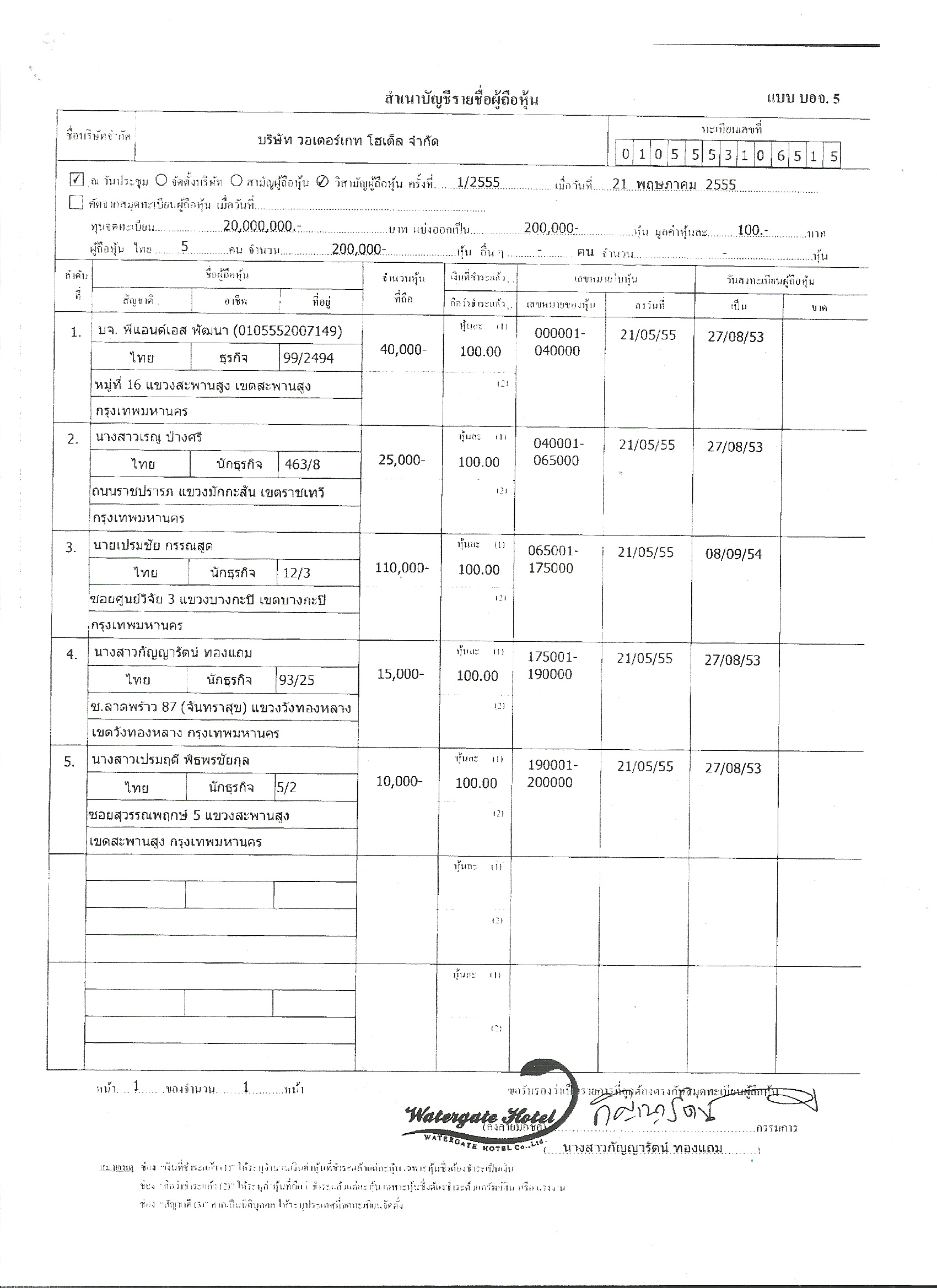 รายชื่อผู้ถือหุ้น บริษัท วอเตอร์เกท โฮเตล จำกัด