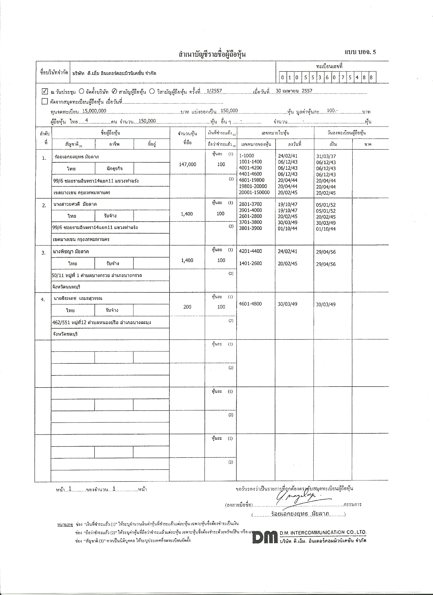 บัญชีรายชื่อผู้ถือหุ้น บริษัท ดี.เอ็ม.อินเตอร์คอมมิวนิเคชั่น จำกัด ณ วันที่ 30 ก.ค.57 มีผู้ถือหุ้น 3 ราย นางศิริวรรณ พานิชตระกูล ถือหุ้นใหญ่ 149,998 หุ้น จากทั้งหมด 150,000 หุ้น มูลค่าหุ้นละ 100 บาท