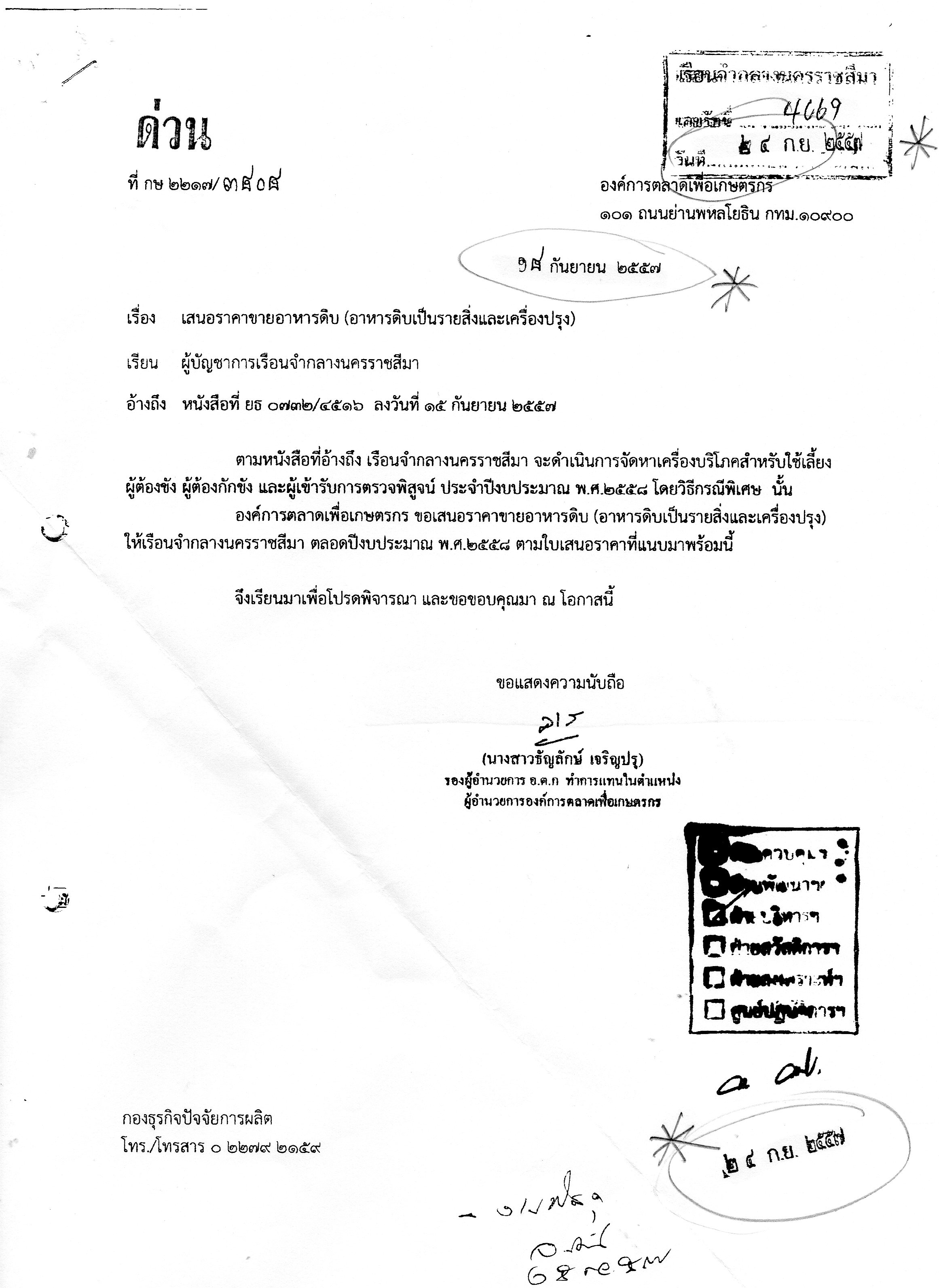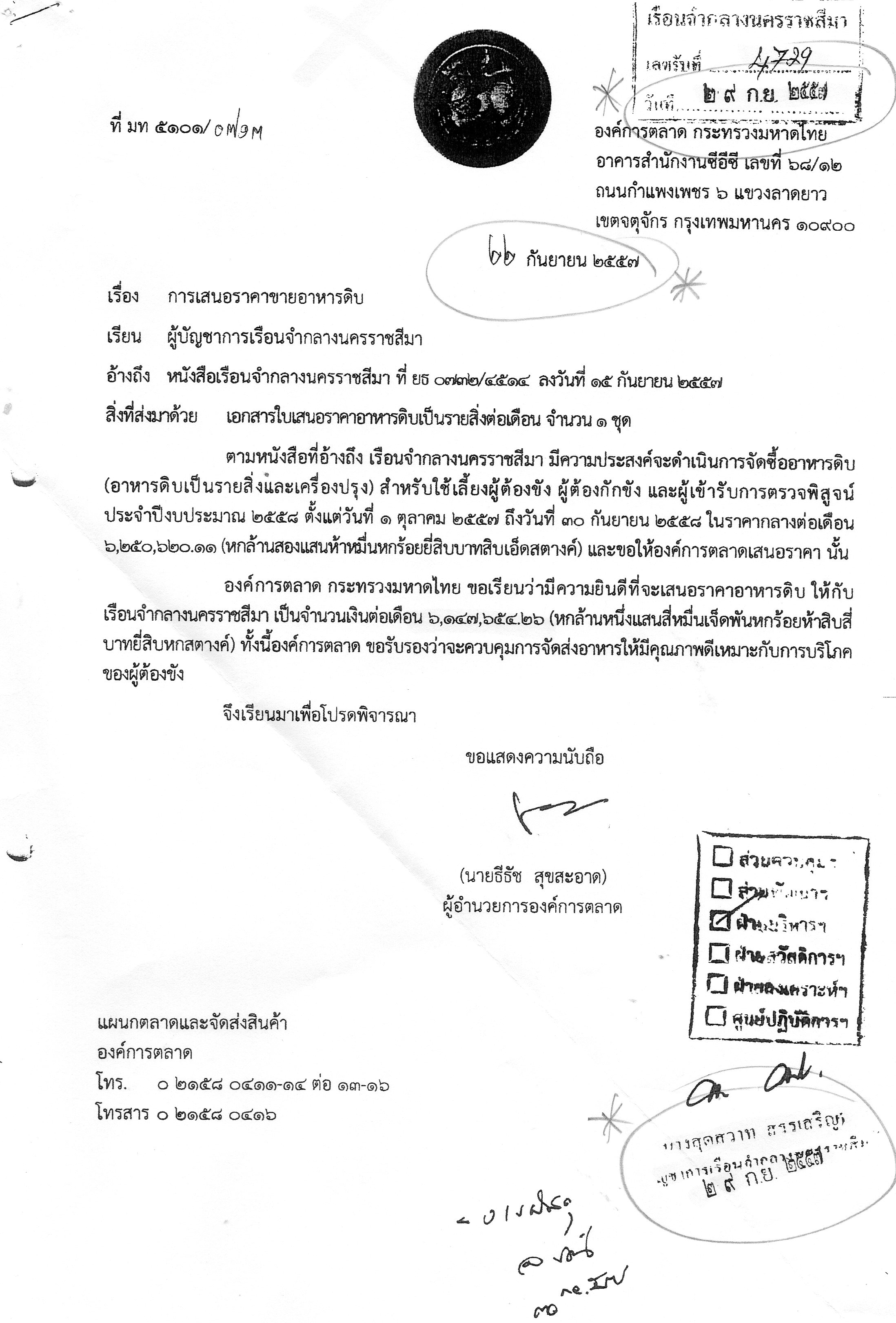 2.องค์การตลาด (อต.) โดยนายธีรัช สุขสะอาด ผู้อำนวยการ ยื่นเสนอราคาวันที่ 22 ก.ย.57 ตามกำหนด แต่หัวหนังสือใบเสนอราคาดังกล่าว เรือนจำกลางนครราชสีมา ประทับลงเลขรับ วันที่ 29 ก.ย.57 และนางสุดสวาท สรรเสริญ ผู้บัญชาการเรือนจำกลางนครสวรรค์ ได้ลงลายมือชื่อกำกับ วันที่ 29 ก.ย.57 เท่ากับ อต.ส่งใบเสนอราคาเลยวันกำหนดมาแล้ว 7 วัน (ดูเอกสาร)