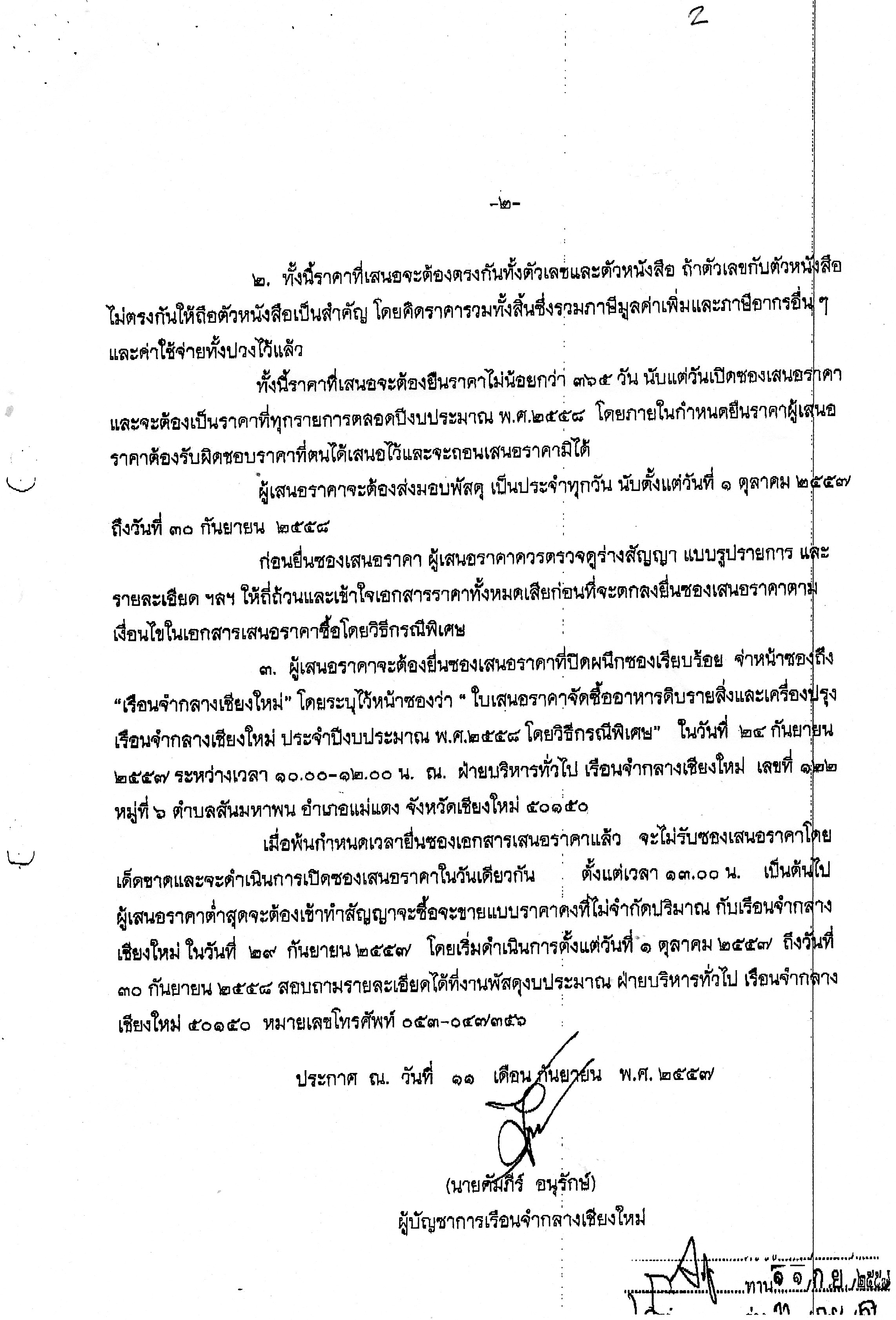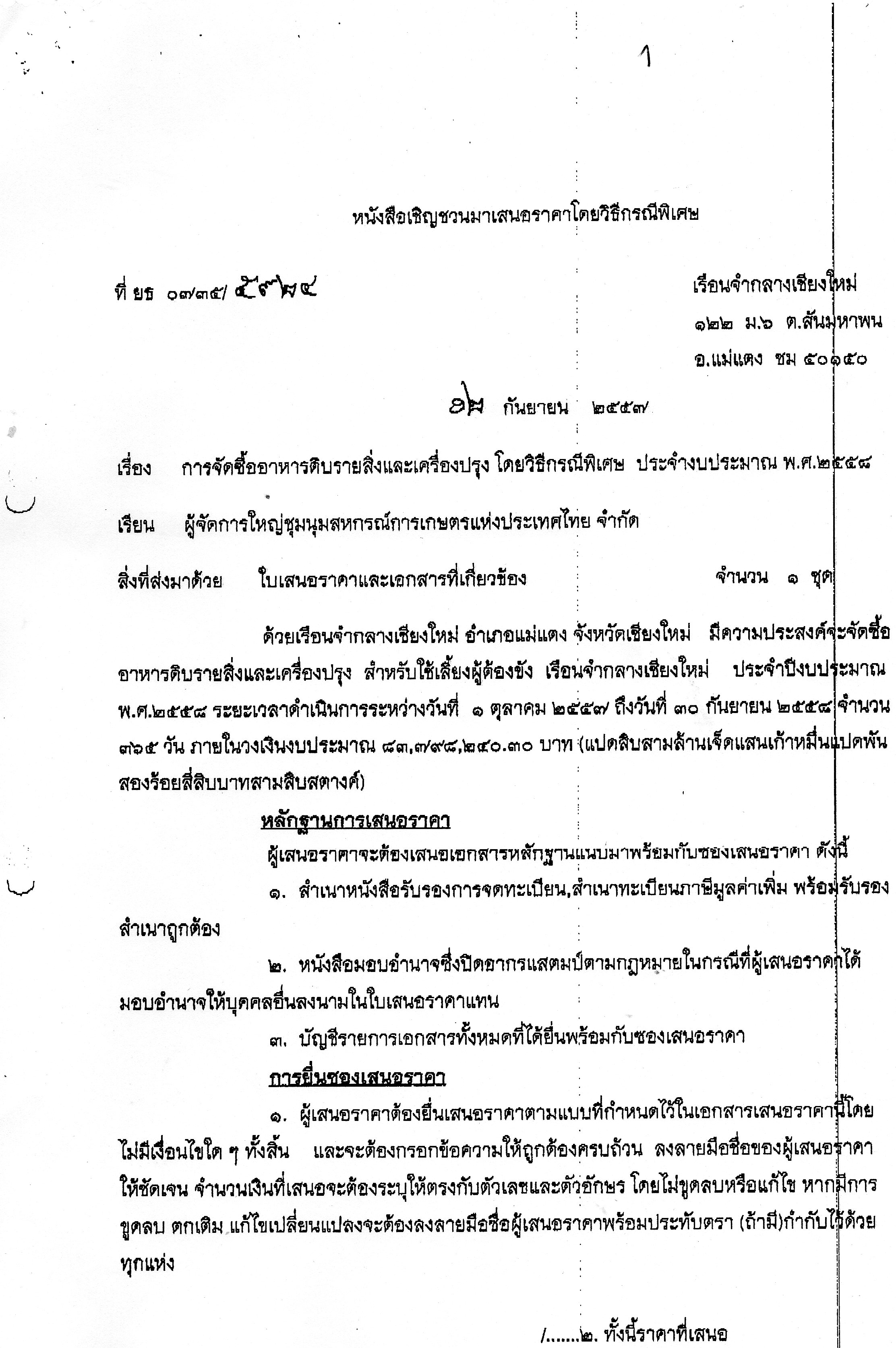 “ผู้เสนอราคาจะต้องยื่นซองเสนอราคาที่ปิดผนึกซองเรียบร้อย จ่าหน้าซองถึงเรือนจำกลางเชียงใหม่ โดยระบุไว้หน้าซองว่า ใบเสนอราคาจัดซื้ออาหารดิบรายสิ่งและเครื่องปรุงเรือนจำกลางเชียงใหม่ ประจำปีงบประมาณ 2558 โดยวิธีกรณีพิเศษ ในวันที่ 24 ก. ย. 57 เวลา 10.00 -12.00 น. ณ ฝ่ายบริหารทั่วไป เรือนจำกลางเชียงใหม่” (ดูเอกสาร)