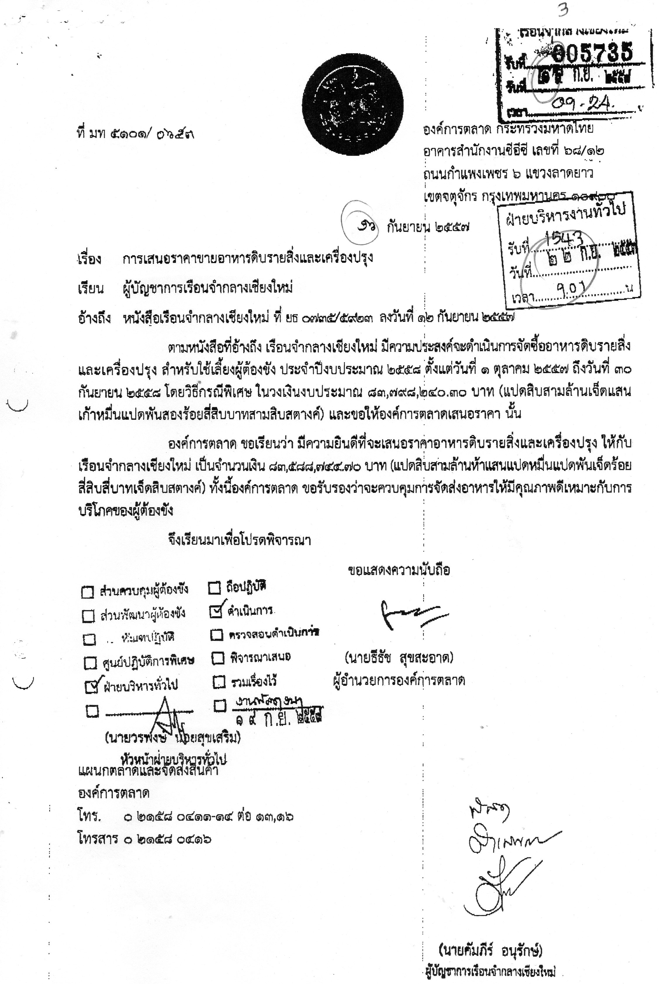 1.องค์การตลาด โดยนายธีรัช สุขสะอาด ผู้อำนวยการ ทำหนังสือที่ มท.5101/0653 วันที่ 16 ก.ย.57 เสนอราคาจัดซื้ออาหารดิบ ถึงผู้บัญชาการเรือนจำกลางเชียงใหม่ ฝ่ายงานพัสดุฯรับหนังสือวันที่ 19 ก.ย.57 ขณะที่ฝ่ายบริหารงานทั่วไปลงรับใบเสนอราคาจากงานพัสดุในวันที่ 22 กันยายน 57 เวลา 09.01 น. และ เรือนจำกลางลงรับในวันที่ 24 ก.ย. 57 เวลา 09.24 น.