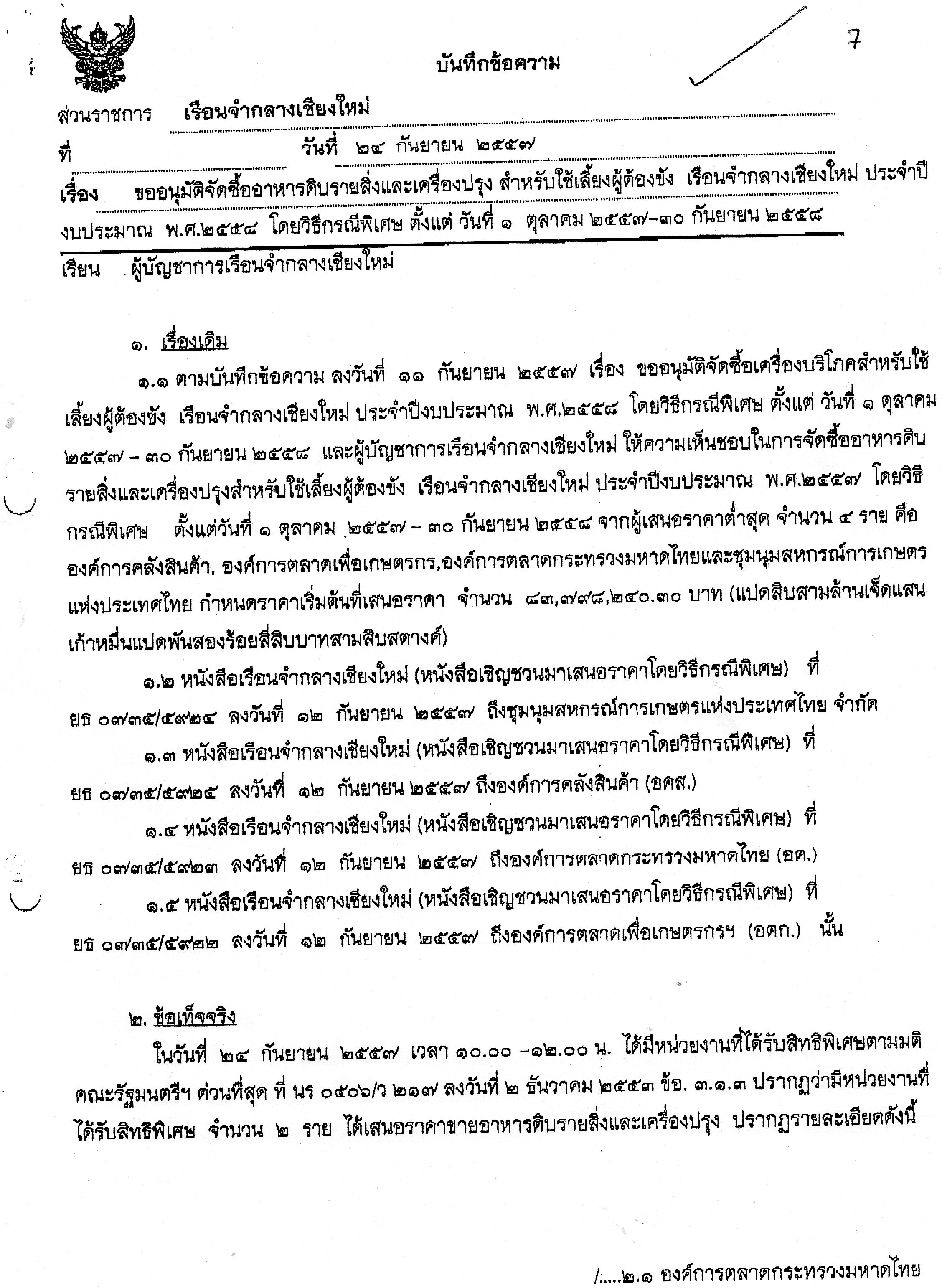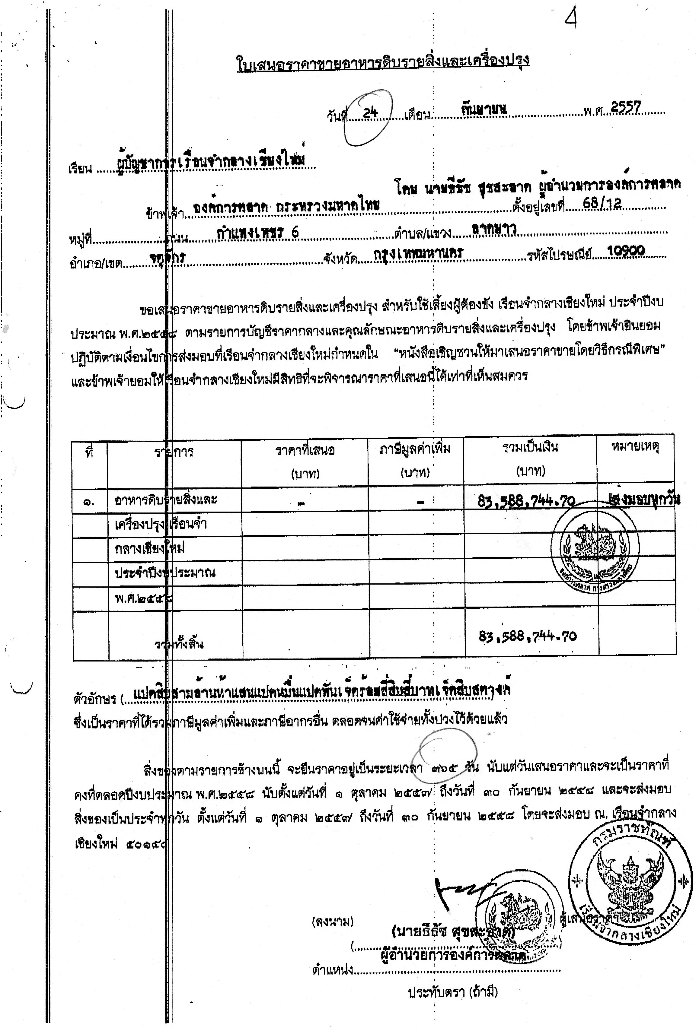 12 ก.ย.58 เรือนจำจังหวัดเชียงใหม่ กำหนดราคากลางจัดซื้ออาหารดิบ 83,798,240.30 บาท โดยส่งหนังสือเชิญให้หน่วยงานที่แห่งมาเสนอราคา ได้แก่ ชุมนุมสหกรณ์การเกษตรแห่งประเทศไทย (ชสท.) องค์การคลังสินค้า (อคส.) องค์การตลาด (อต.) กระทรวงมหาดไทย และ องค์การตลาดเพื่อเกษตรกร (อตก.) กำหนดให้ยื่นซองเสนอราคาในวันที่ 24 ก.ย.57 เวลา 10.00-12.00 น. มีผู้เสนอราคา 2 ราย