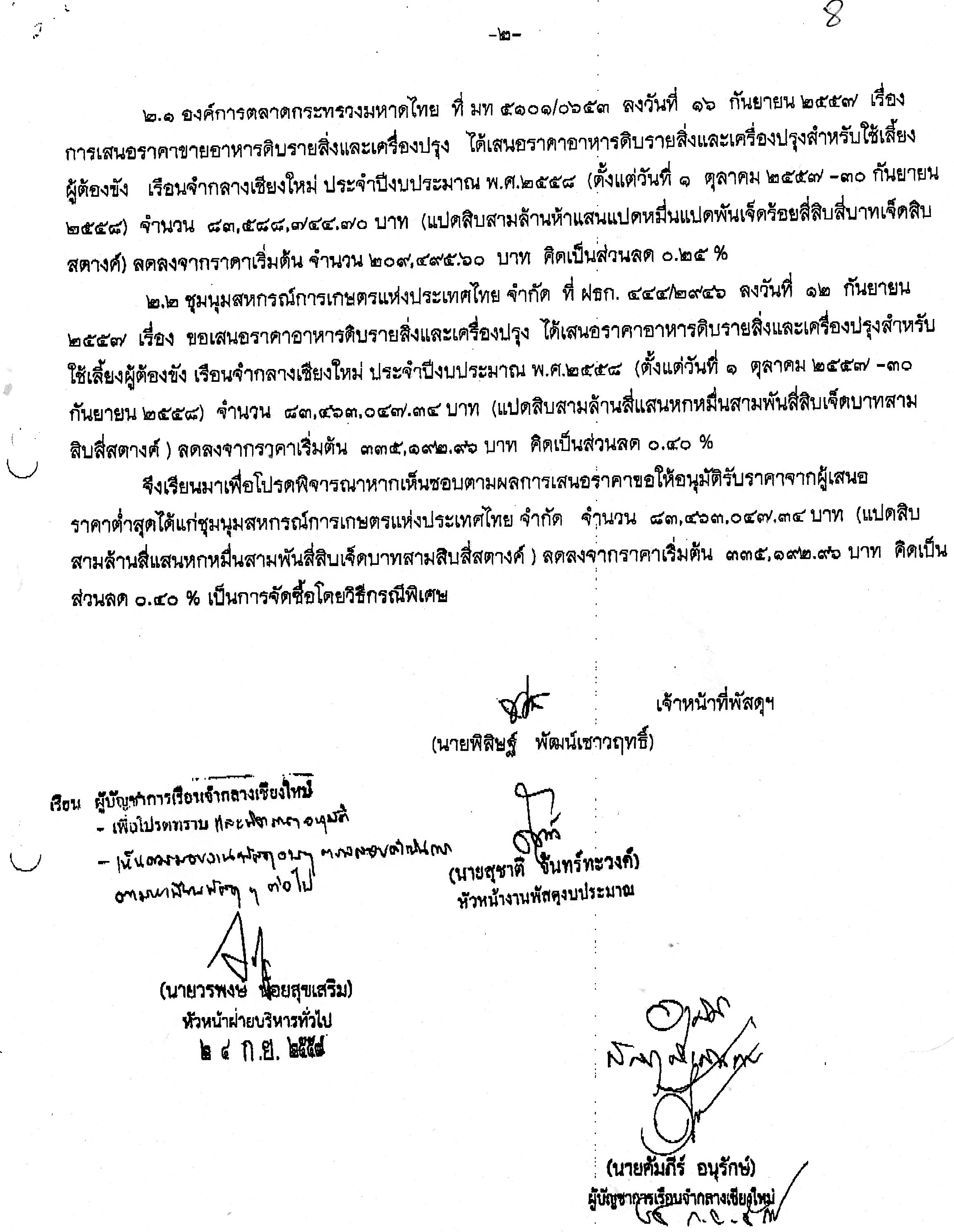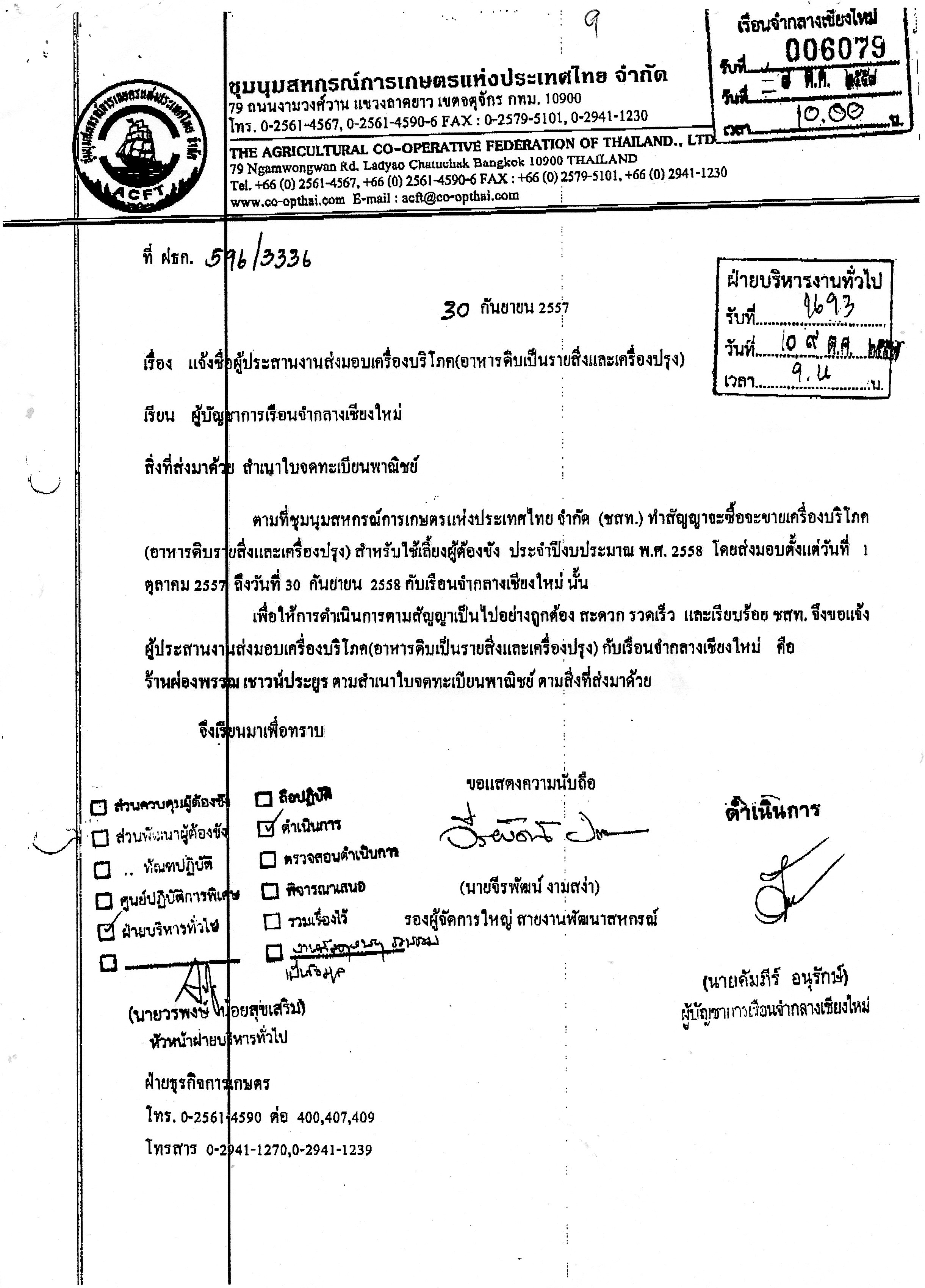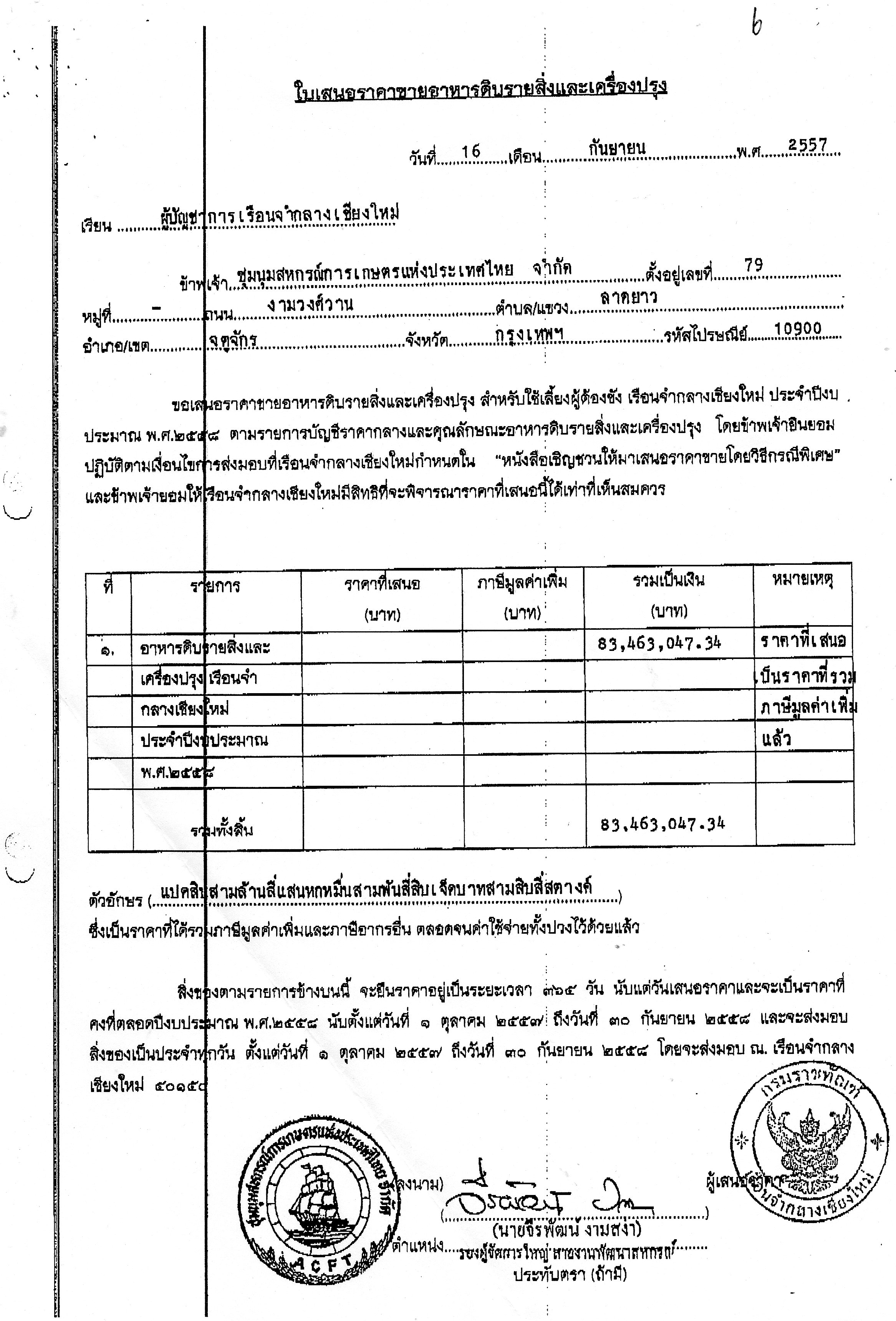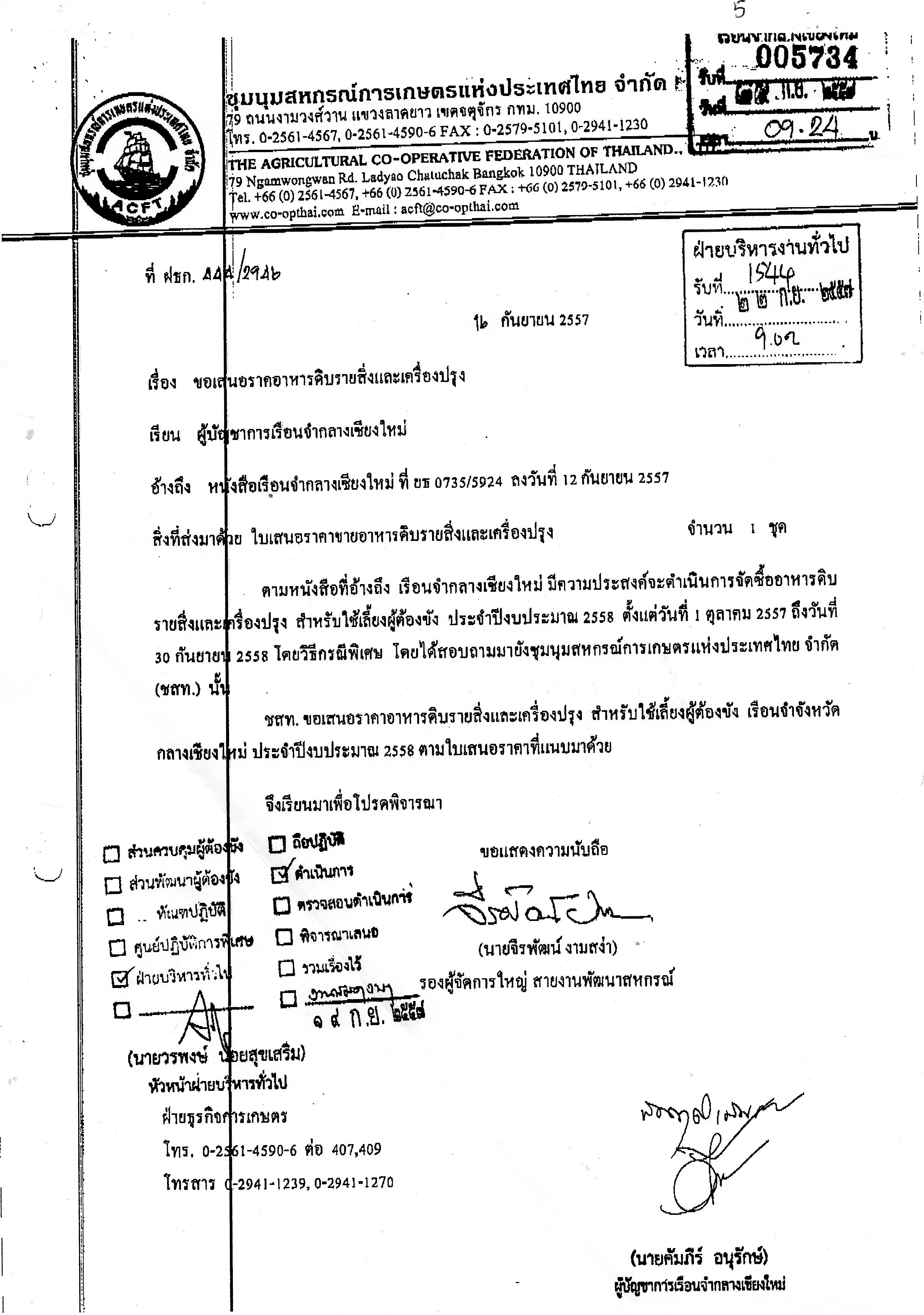 2.ชุมนุมสหกรณ์การเกษตรแห่งประเทศไทย โดยนายจิรพัฒน์ งามสง่า รองผู้จัดการใหญ่ สายงานพัฒนาสหกรณ์ ทำหนังสือที่ ฝธก.444/2946 ลงวันที่ 16 ก.ย.57 ถึงผู้บัญชาการเรือนจำกลางเชียงใหม่ เสนอราคาจัดซื้ออาหารดิบ ฝ่ายงานพัสดุฯรับหนังสือเสนอราคาวันที่ 19 ก.ย.57 ขณะที่ฝ่ายบริหารงานทั่วไปลงรับใบเสนอราคาจากงานพัสดุในวันที่ 22 ก.ย. 57 เวลา 09.02 น. และ เรือนจำกลางลงรับในวันที่ 24 ก.ย. 57 เวลา 09.24 น.
