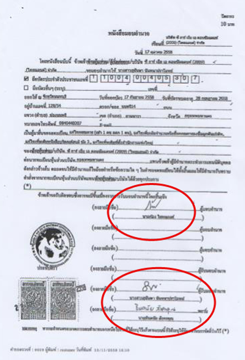 - เป็น‘ผู้รับมอบอำนาจ’จาก น.ส.สาธิตา ธูปทอง กรรมการและผู้ถือหุ้นบริษัท โอบามาเก้ากรุ๊ป จำกัด ในการยื่นจดทะเบียนแก้ไขเพิ่มเติมจำนวนกรรมการและหรือ/อำนาจกรรมการ ต่อนายทะเบียนหุ้นส่วนบริษัทนนทบุรี เมื่อ 23 พ.ค.55