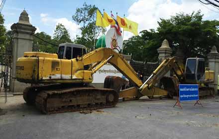1 รถแบ็คโฮ 2 คัน ถูกนำมาใช้ปิดประตูทางเข้า-ออกวัดพระธรรมกายด้านที่ไม่ใช่ประตูใหญ่ หรือประตู 7
