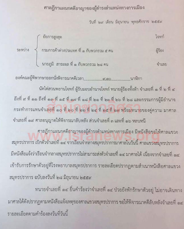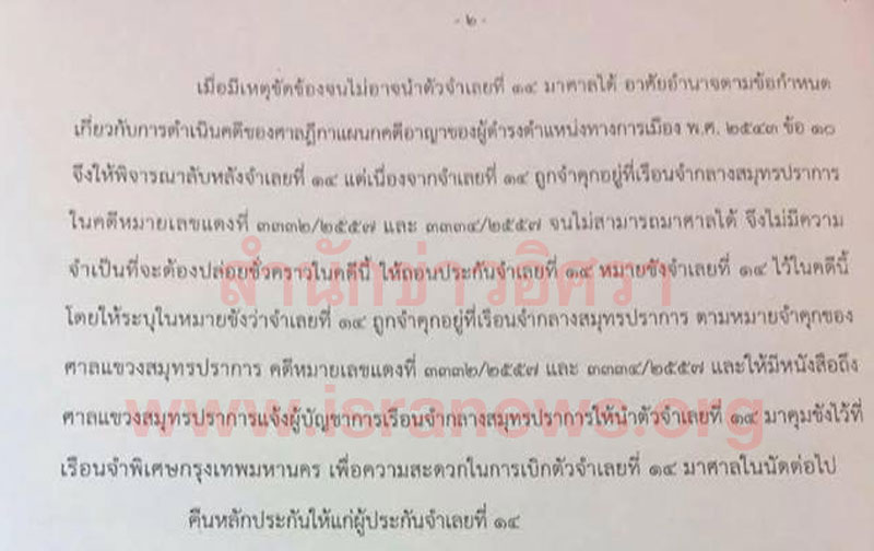 เปิดหนังสือคำสั่งศาลฎีกาฯ ถอนประกัน ‘เสี่ยเปี๋ยง’ นำตัวมาเรือนจำพิเศษกรุงเทพฯ เหตุถูกจำคุกในคดียักยอกข้าวของรัฐอยู่แล้ว อนุญาตพิจารณาคดีลับหลังได้ ให้เลขาฯศาล-เลขาฯองค์คณะตรวจสอบปมเว็บไซต์พรรคเพื่อไทย-ispacethailand แพร่บทความข้อเท็จจริงคดีระบายข้าว