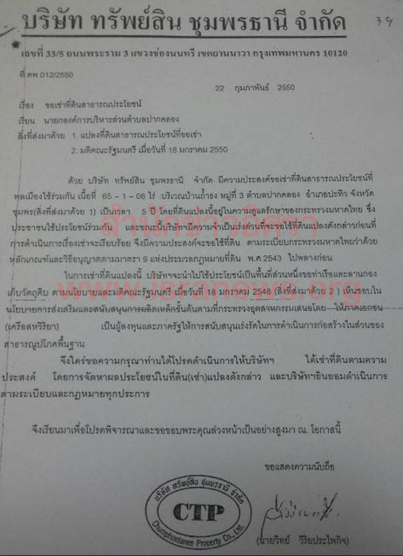 กระทั่งปี 2550 องค์การบริหารส่วนตำบลปากคลอง พยายามยกที่ดินสาธารณะ 65 ไร่ดังกล่าวให้ บริษัท ทรัพย์สิน ชุมพรธานี จำกัด เป็นผู้เช่าทำประโยชน์