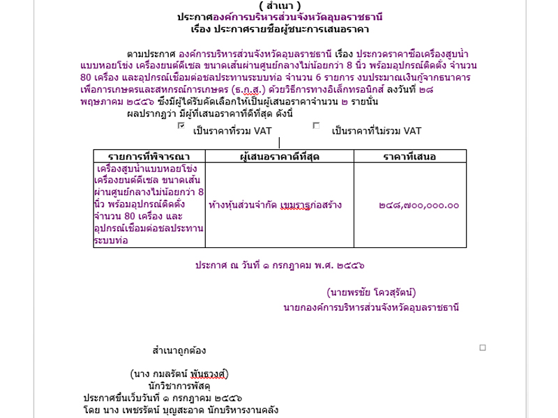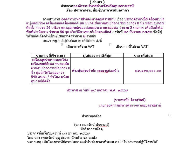 ทั้งนี้ อบจ.อุบลราชธานี ทำสัญญาจัดซื้อเครื่องสูบน้ำจากเอกชน 2 สัญญา