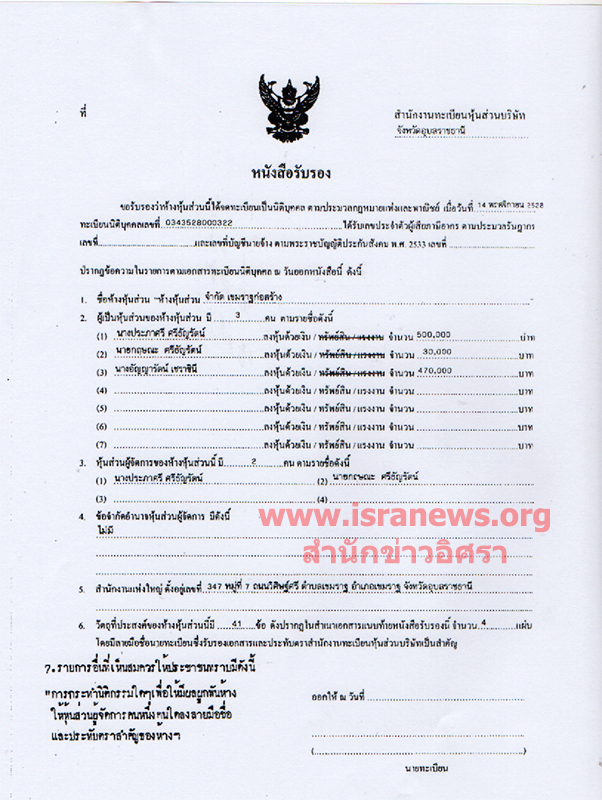จากการตรวจสอบข้อมูลกับกรมพัฒนาธุรกิจการค้าพบว่า หจก.เขมราฐก่อสร้าง จดทะเบียนวันที่ 14 พฤศจิกายน 2528 ทุน 1 ล้านบาท ประกอบธุรกิจรับเหมาก่อสร้าง ที่ตั้งเลขที่ 347 หมู่ที่ 7 ถนนวิศิษฐ์ศรี ตำบลเขมราฐ อำเภอเขมราฐ จังหวัดอุบลราชธานี (ที่ตั้งสำนักงานบัญชีเลขที่ 33 ถ.อรุณประเสริฐ ต.เขมราฐ อ.เขมราฐ จ.อุบลราชธานี) นางประภาศรี ศรีธัญรัตน์ ,นางอัญญารัตน์ เชราชินี ,นายกฤษณะ ศรีธัญรัตน์ ร่วมกันถือหุ้น นางประภาศรี ศรีธัญรัตน์ และ นาย กฤษณะ ศรีธัญรัตน์ เป็นหุ้นส่วนผู้จัดการ