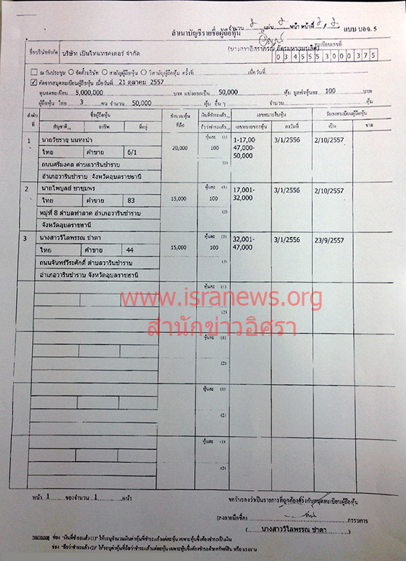 นายไพบูลย์ ชาชุมพร 15,000 หุ้น (รับโอนมาจาก นายดุษฎี ศรีธัญรัตน์) น.ส.วิไลพรรณ ขำตา 15,000 หุ้น รวม 50,000 หุ้น มูลค่าหุ้นละ 100 บาท น.ส.วิไลพรรณ ขำตา อยู่บ้านเลขที่ 44 ถ.จันทร์วีระศักดิ์ อ.วารินชำราบ จ.อุบลราชธานี เข้ามาเป็นกรรมการแทน (ดูเอกสาร)