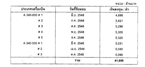 "..ตามที่คณะรัฐมนตรี (ครม.) ได้มีมติเมื่อวันที่ 5 สิงหาคม 2546 ให้ บกท. ดำเนินโครงการ จัดหาเครื่องบินตามแผนวิสาหกิจ ปี 2545/2546 – 2549/2550 เพื่อจัดหาเครื่องบินเพิ่มเติม จำนวน 15 ลำ ประกอบด้วยเครื่องบินใช้แล้ว แบบ B747 – 400 ของสายการบินยูไนเต็ดแอร์ไลน์ จำนวน 7 ลำ เครื่องบินแบบ A340 – 500 จำนวน 3 ลำ และเครื่องบินแบบ A340 – 600 จำนวน 5 ลำ แต่ บกท.ไม่สามารถรับมอบเครื่องบินที่ใช้แล้วแบบ B747 – 400 จำนวน 7 ลำ ทำให้ บกท. ไม่สามารถเพิ่มปริมาณการผลิตในปี 2546/47 – 2547/48 บกท. จึงได้เลื่อนการรับมอบเครื่องบิน แบบ A340 -500/600 ให้เร็วขึ้น และปรับปรุงแผนวิสาหกิจฉบับเดิม (ปี 2545/46 – 2549/50) เป็นแผนวิสาหกิจฉบับใหม่ ปี 2548/49 – 2552/53.."