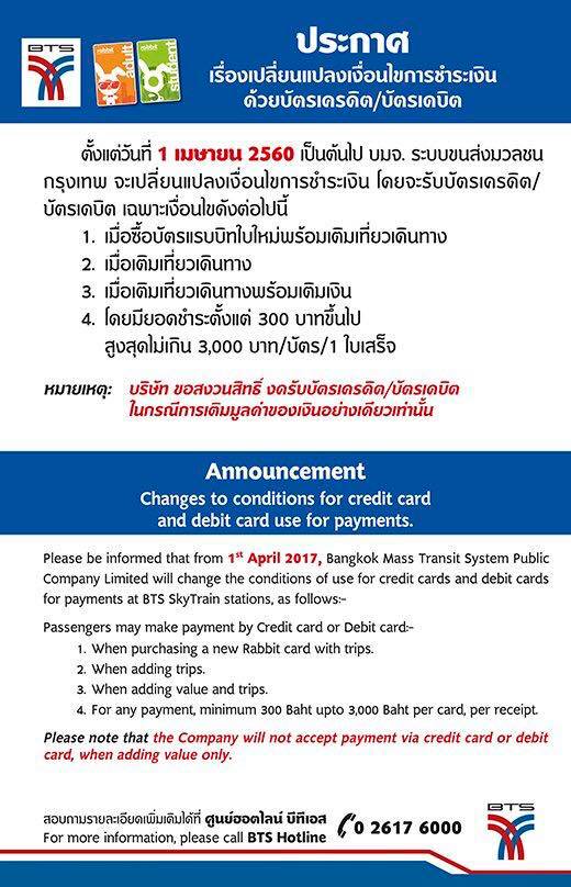 BTS แจงเหตุ 1 เมษาฯ ไม่รับบัตรเครดิตหรือบัตรเดบิตเติมเงินบัตรแรบบิท เนื่องจากมีประชาชนบางกลุ่มใช้เติมเพื่อเอาส่วนลดร้านอาหารเพียงอย่างเดียว แต่ไม่ได้ใช้บริการบีทีเอส