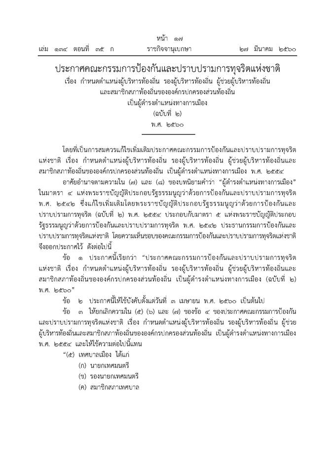 สำนักข่าวอิศรา www.isranews.org รายงานว่า เมื่อวันที่ 27 มี.ค. 2560 ราชกิจจานุเบกษาเผยแพร่ประกาศคณะกรรมการป้องกันและปราบปรามการทุจริตแห่งชาติ เรื่อง กําหนดตําแหน่งผู้บริหารท้องถิ่น รองผู้บริหารท้องถิ่น ผู้ช่วยผู้บริหารท้องถิ่นและ สมาชิกสภาท้องถิ่นขององค์กรปกครองส่วนท้องถิ่น เป็นผู้ดํารงตําแหน่งทางการเมือง (ฉบับที่ 2) พ.ศ. 2560 โดยมีสาระสำคัญว่า ผู้ดำรงตำแหน่ง ได้แก่ ที่ปรึกษาและเลขานุการนายกเทศมนตรี ของเทศบาลเมือง ที่ปรึกษาและเลขาฯนายกเทศมนตรีของเทศบาลตำบล และเลขาฯนายกองค์การบริหารส่วนตำบล (อบต.) ไม่ต้องยื่นบัญชีแสดงรายการทรัพย์สินและหนี้สินและเอกสารประกอบ ต่อ คณะกรรมการ ป.ป.ช โดยมีผลบังคับใช้ตั้งแต่วันที่ 3 เม.ย. 2560