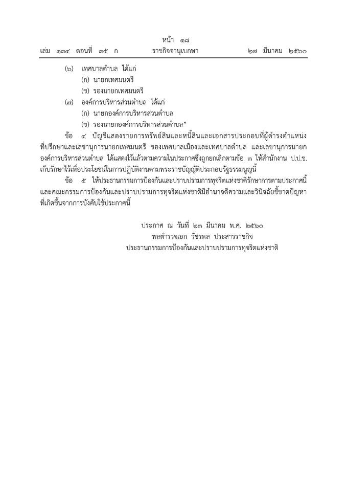 ป.ป.ช.คลอดประกาศฉบับใหม่ ยกเลิก นักการเมืองท้องถิ่น ที่ปรึกษา-เลขาฯนายกเทศมนตรี เทศบาลตำบล- เมือง - ตำบล- อบต. ไม่ต้องยื่นบัญชีทรัพย์สิน มีผลบังคับใช้ 3 เม.ย. 60 พบ 3 ปีโดนเชือดกว่า 100 คน