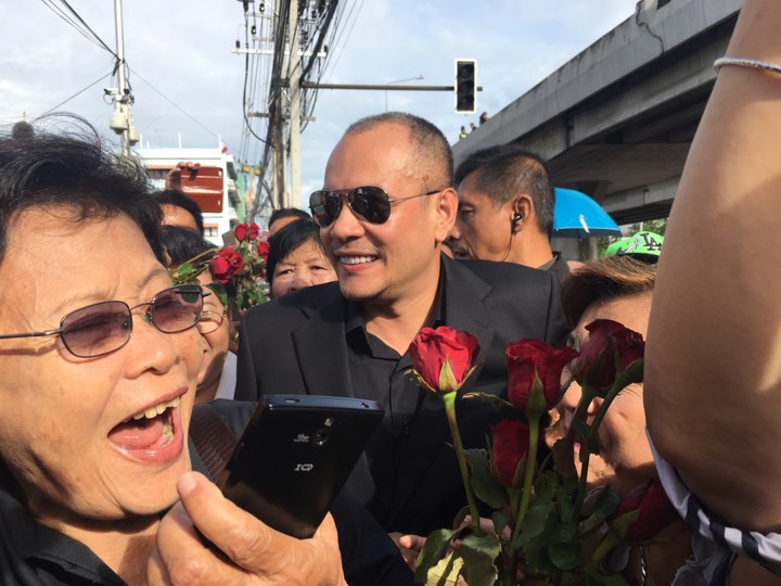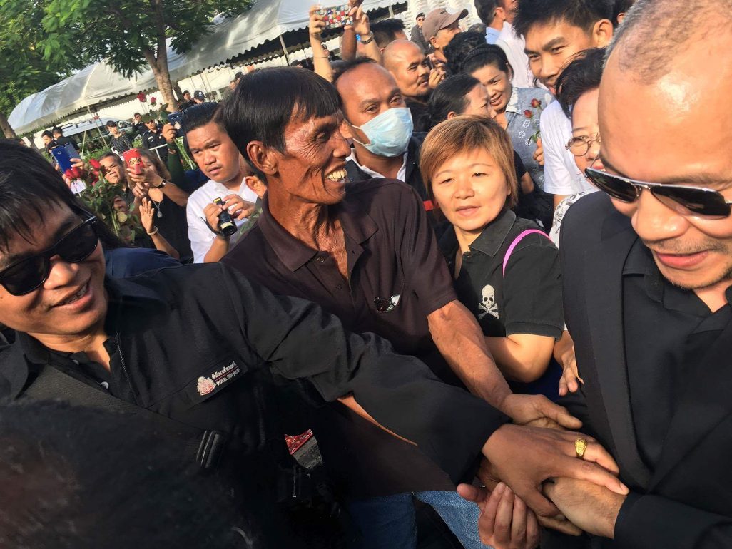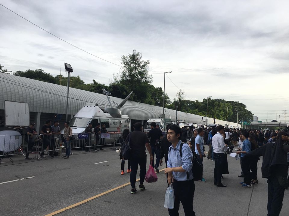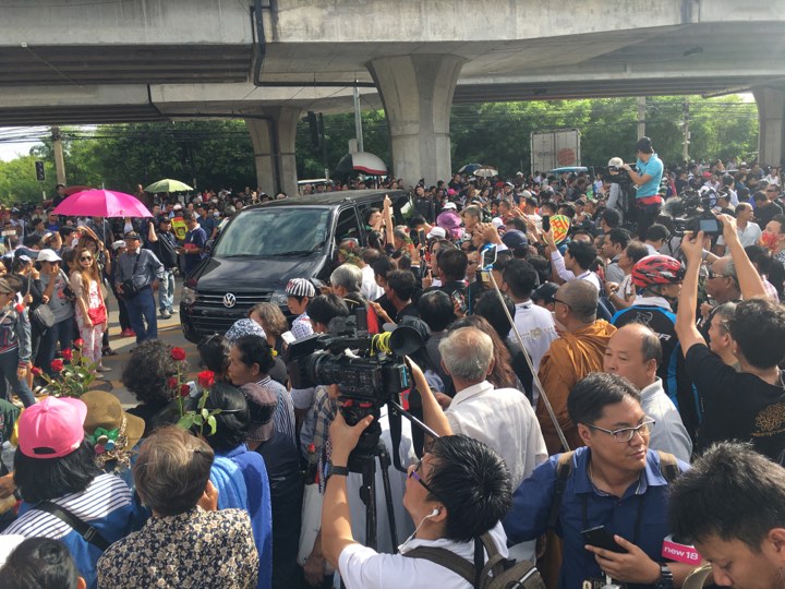 ขณะที่เจ้าหน้าที่ตำรวจได้ออกมาอำนวยความสะดวกเส้นทางจราจรบนถนนเเจ้งวัฒนะ พร้อมกับนำน้ำเปล่ามาแจกจ่ายประชาชนที่ยังปักหลักรอให้กำลังใจอยู่