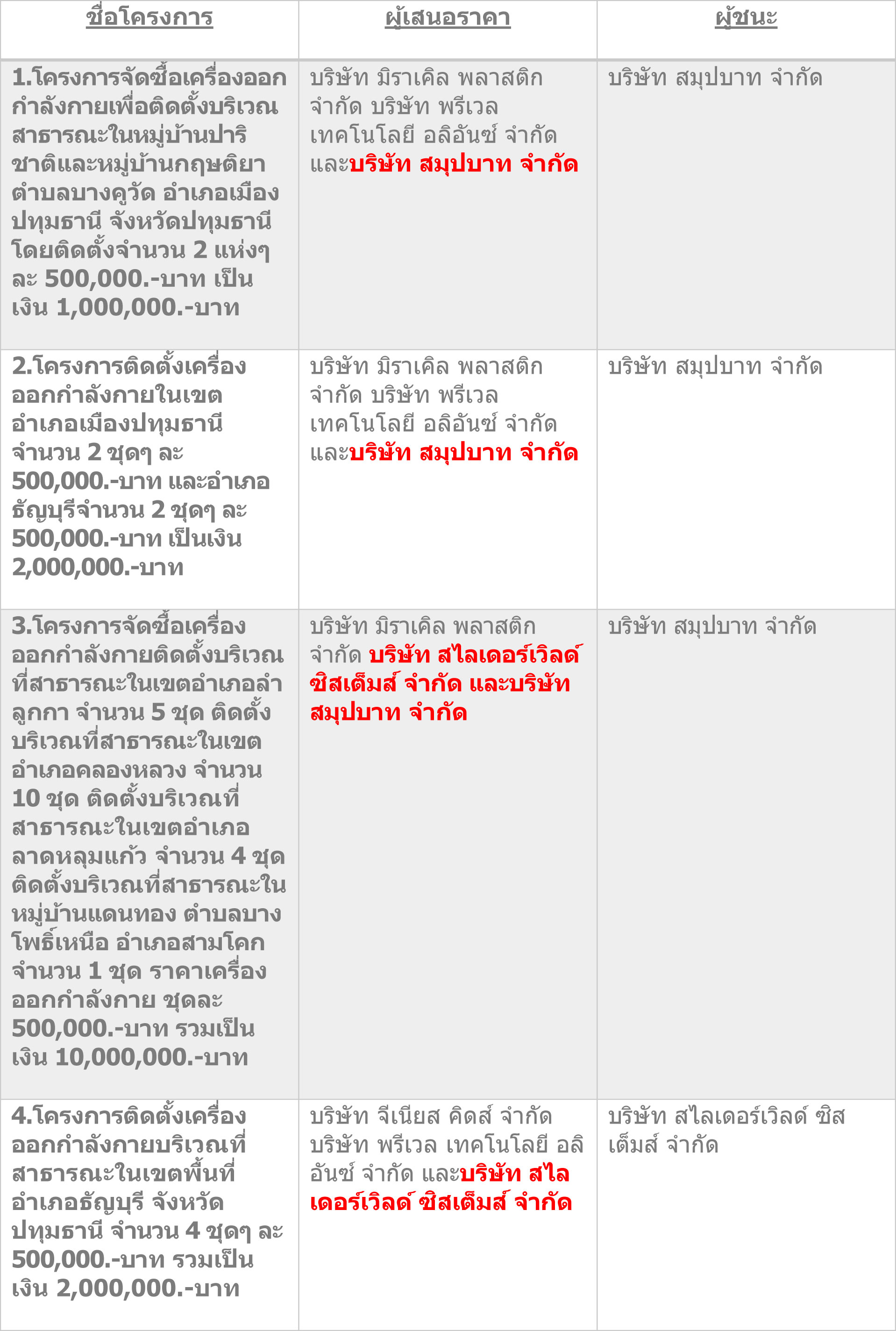 มีผู้ยื่นเอกสารการประกวดราคาซื้อและผ่านการคัดเลือกให้เข้าเสนอราคา จำนวน 3 ราย คือ บริษัท มิราเคิล พลาสติก จำกัด บริษัท สไลเดอร์เวิลด์ ซิสเต็มส์ จำกัด และบริษัท สมุปบาท จำกัด