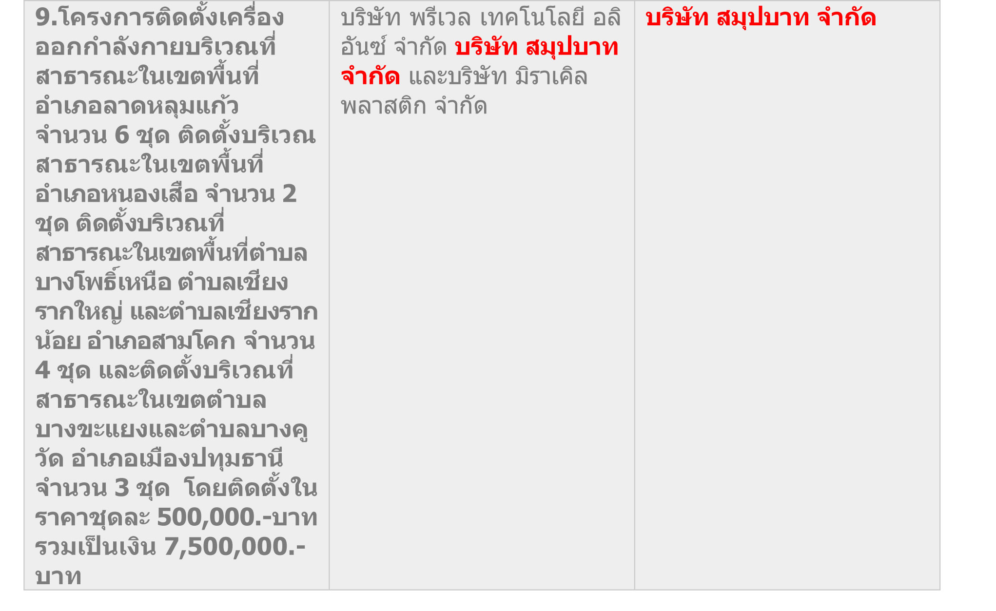 9. โครงการติดตั้งเครื่องออกกำลังกายบริเวณที่สาธารณะในเขตพื้นที่อำเภอลาดหลุมแก้ว จำนวน 6 ชุด ติดตั้งบริเวณสาธารณะในเขตพื้นที่อำเภอหนองเสือ จำนวน 2 ชุด ติดตั้งบริเวณที่สาธารณะในเขตพื้นที่ตำบลบางโพธิ์เหนือ ตำบลเชียงรากใหญ่ และตำบลเชียงรากน้อย อำเภอสามโคก จำนวน 4 ชุด และติดตั้งบริเวณที่สาธารณะในเขตตำบลบางขะแยงและตำบลบางคูวัด อำเภอเมืองปทุมธานี จำนวน 3 ชุด โดยติดตั้งในราคาชุดละ 500,000.-บาท รวมเป็นเงิน 7,500,000.-บาท