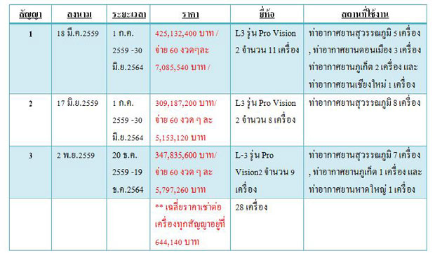 ทำสัญญาเมื่อวันที่ 2 พ.ย.2559 ระบุข้อมูลเครื่องตรวจวัตถุตามร่างกายผู้โดยสาร (Body Scanner) แบบ Automatic Target Detection (ATD) ยี่ห้อ L-3 รุ่น Pro Vision2 จำนวน 9 เครื่อง