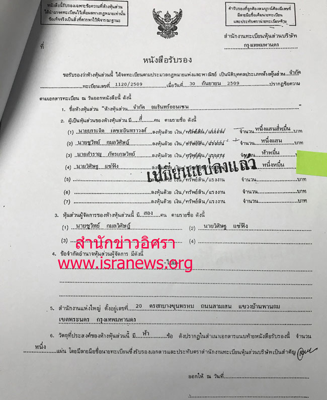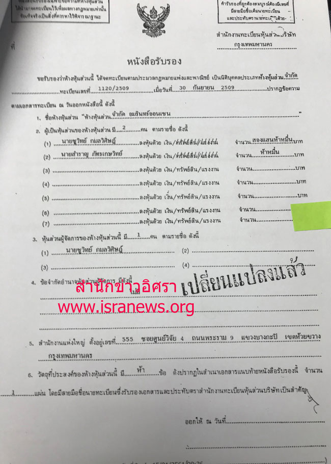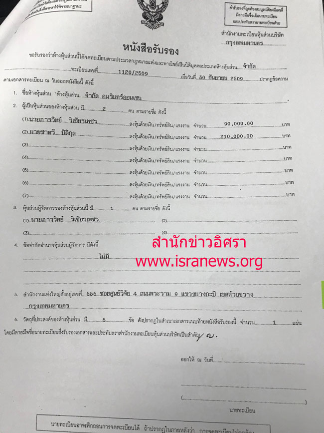 กระทั่งล่าสุด 3 ต.ค.2560 น.ส.ศศิธร วิระเทพสุภรณ์ 250,000 บาท (83.33%) และ นายอภิชาติ แซ่แต้ 50,000 บาท 16.66%) มี น.ส.ศศิธร เป็นหุ้นส่วนผู้จัดการ (ดูเอกสารประกอบ)