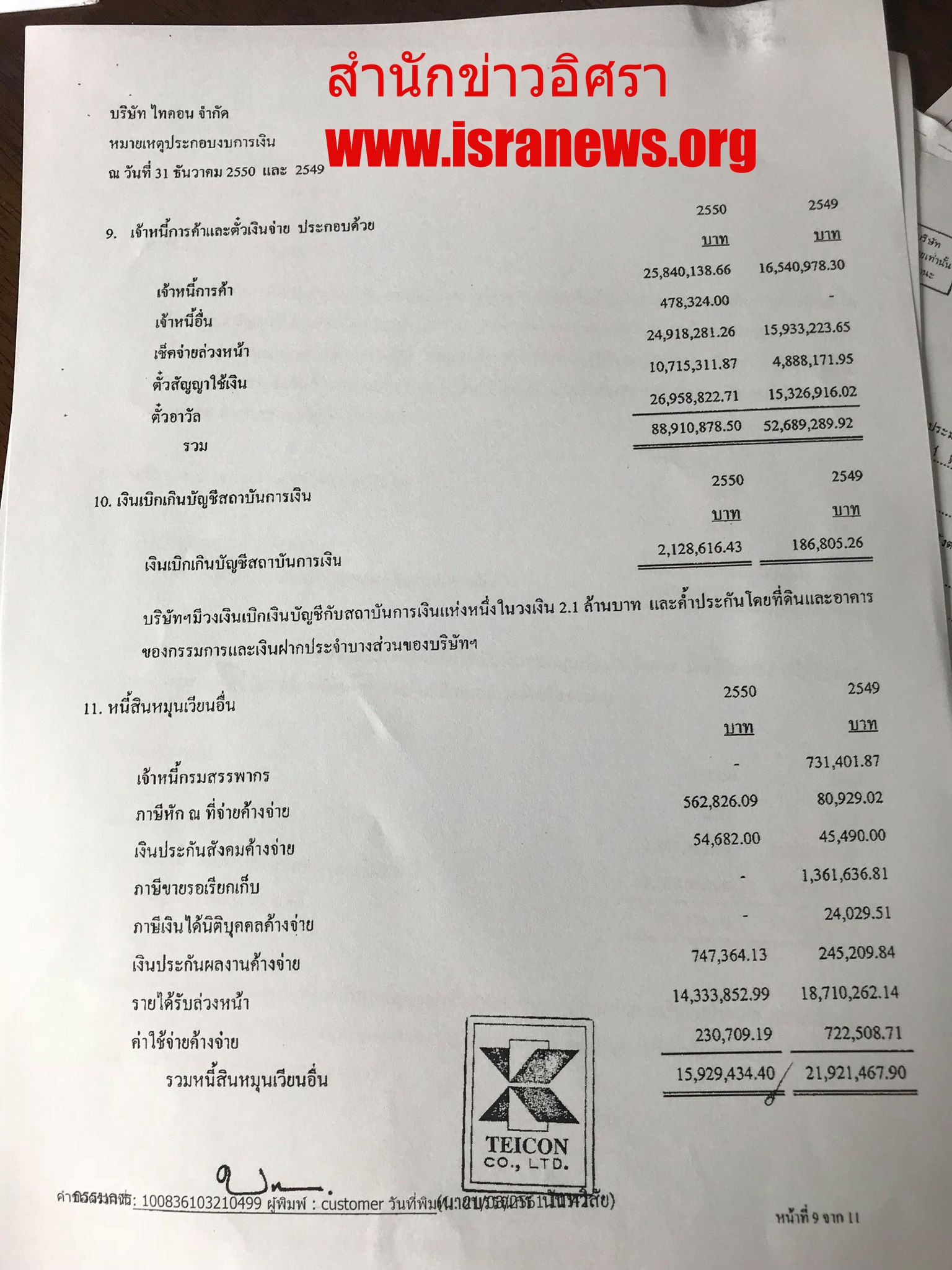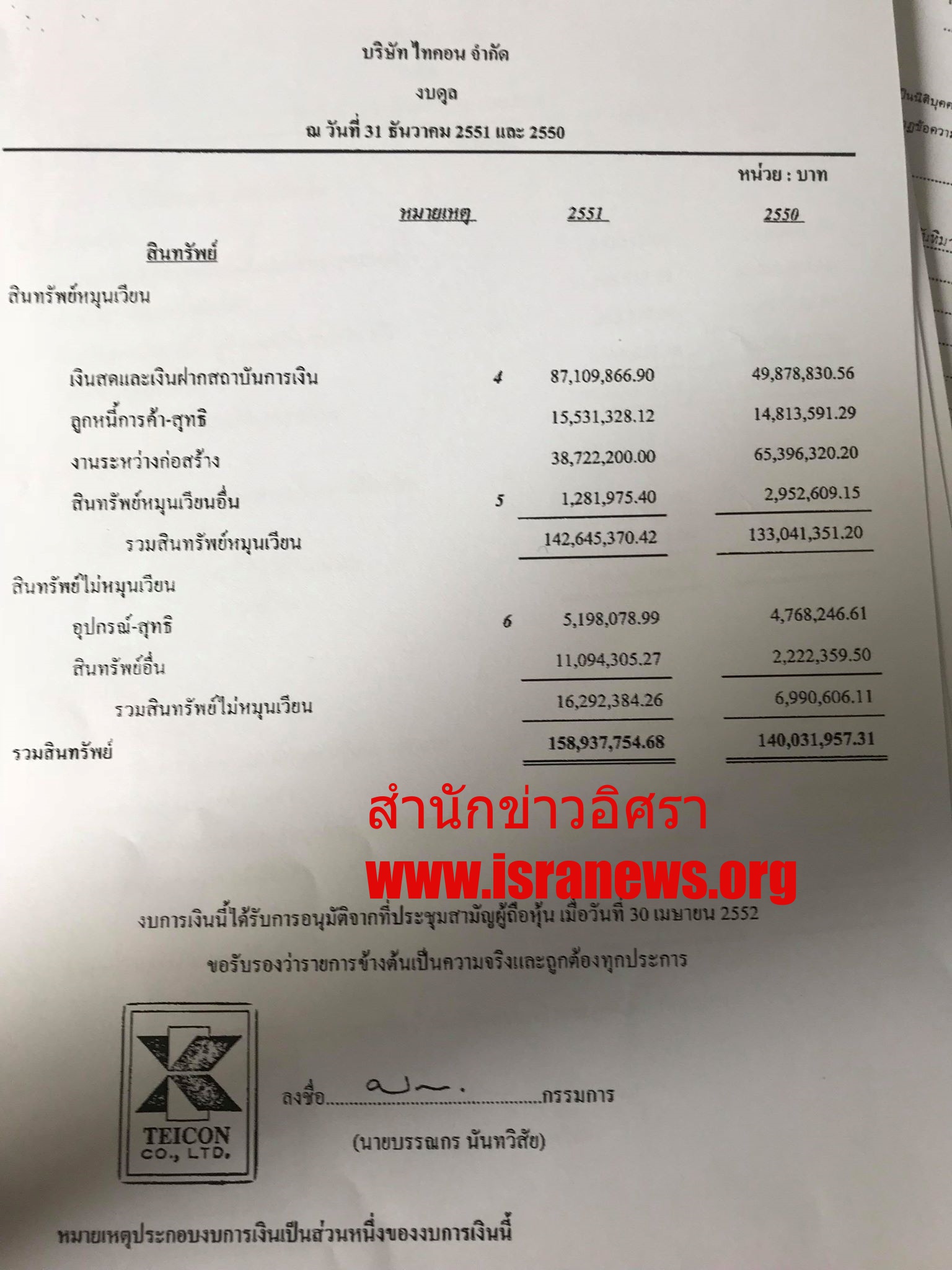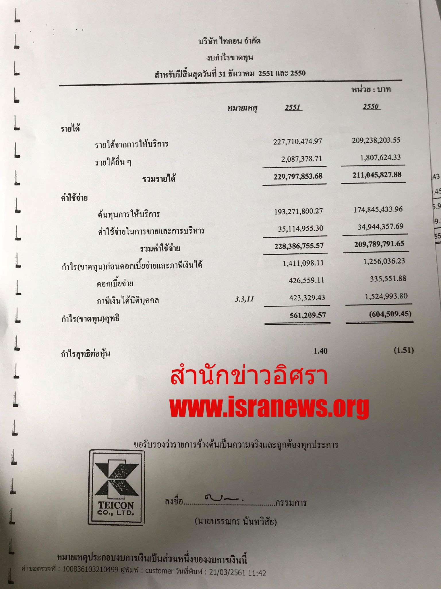 ล่าสุดสำนักข่าวอิศรา ตรวจสอบงบการเงินแสดงผลการประกอบการทางธุรกิจของ บริษัท ไทคอน จำกัด ณ วันที่ 31 ธ.ค.2550 ที่นำส่งให้กรมพัฒนาธุรกิจการค้ารับทราบ เมื่อวันที่ 30 เม.ย.2551 หลังการลงนามในสัญญารับงานว่าจ้างก่อสร้างศูนย์ศึกษาการเพาะเลี้ยงสัตว์น้ำทะเลสาบสงขลา (อควาเรียม) จากสำนักงานคณะกรรมการการอาชีวศึกษา เมื่อวันที่ 21 ธ.ค.2550