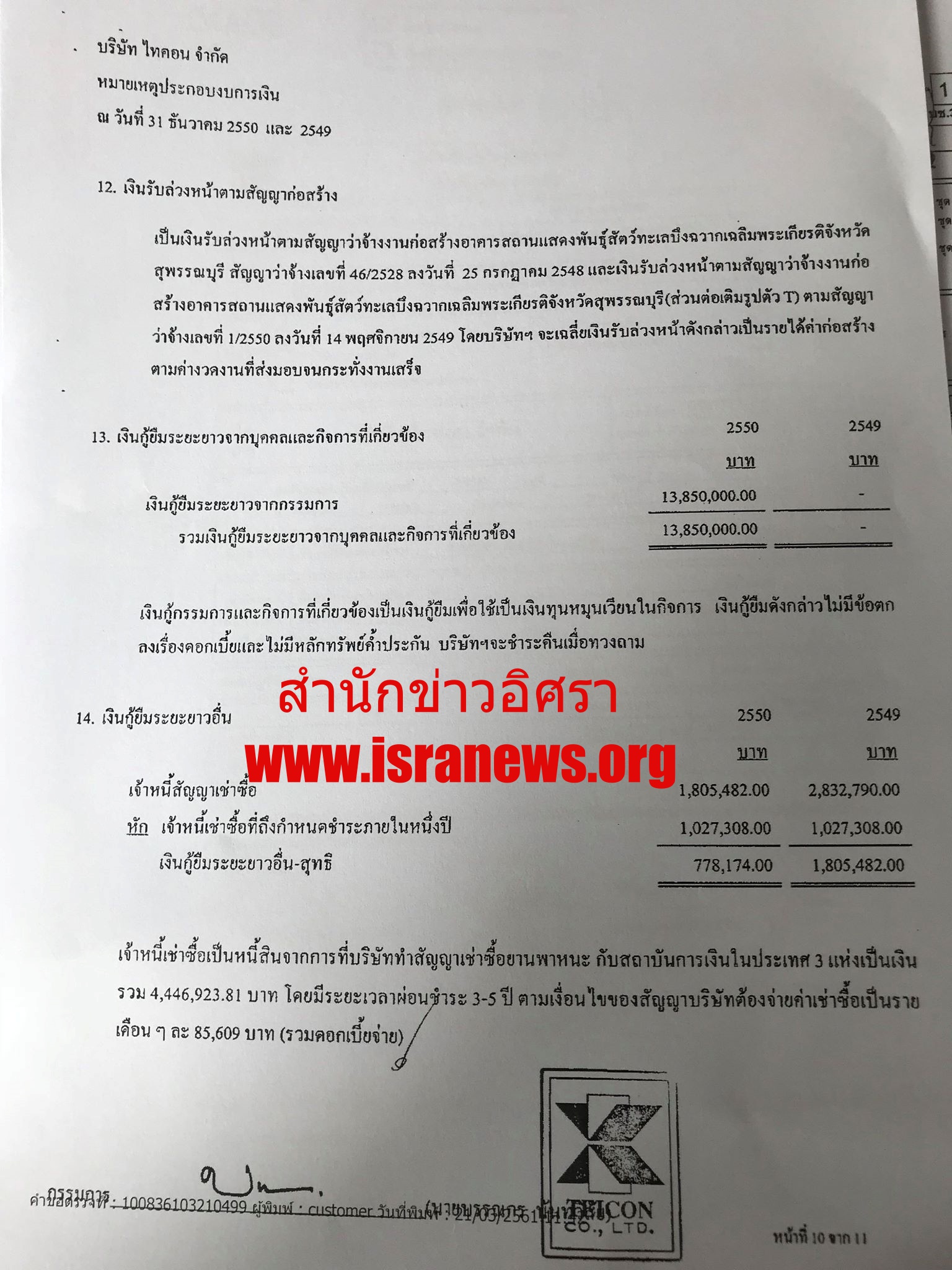 ขณะที่ในหมายเหตุงบการเงิน ระบุว่า บริษัทมีีรายได้รับล่วงหน้าตามสัญญาจ้างงานก่อสร้างอาคารสถานแสดงพันธุ์สัตว์ทะเล บึงฉวากเฉลิมพระเกียรติ จ.สุพรรณบุรี สัญญาเลขที่ 46/2548 และรับเงินตามสัญญาจ้างล่วงหน้า งานก่อสร้างสถานแสดงพันธ์สัตว์ทะเลบึงฉวาก เฉลิมพระเกียรติฯ(ส่วนต่อเติมรูปตัว T) กว้าง18ม. ยาว30ม. สัญญาเลขที่ 1/2550 โดยระบุ ว่าบริษัทจะเฉลี่ยเงินรับล่วงหน้าดังกล่าวเป็นรายได้ค่าก่อสร้างตามค่างวดงานที่ส่งมอบจนกระทั่งงานเสร็จ (ดูเอกสารประกอบ)